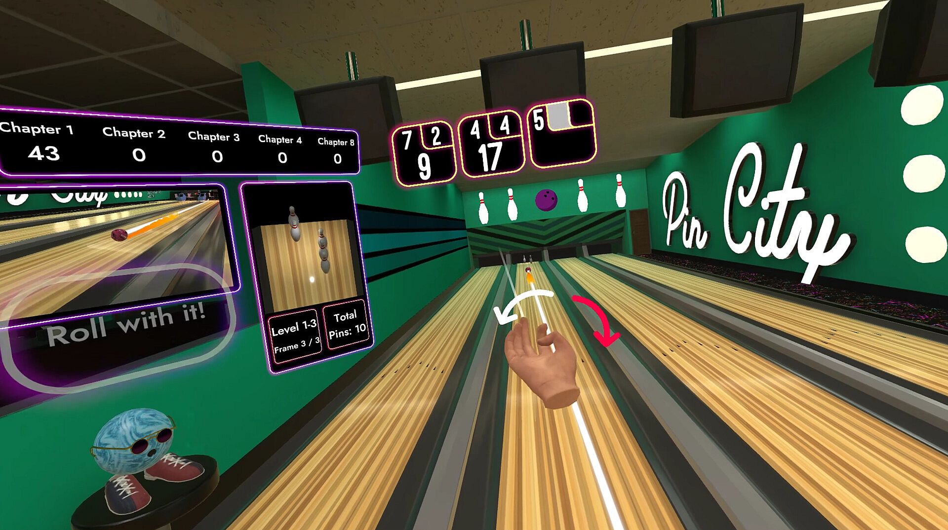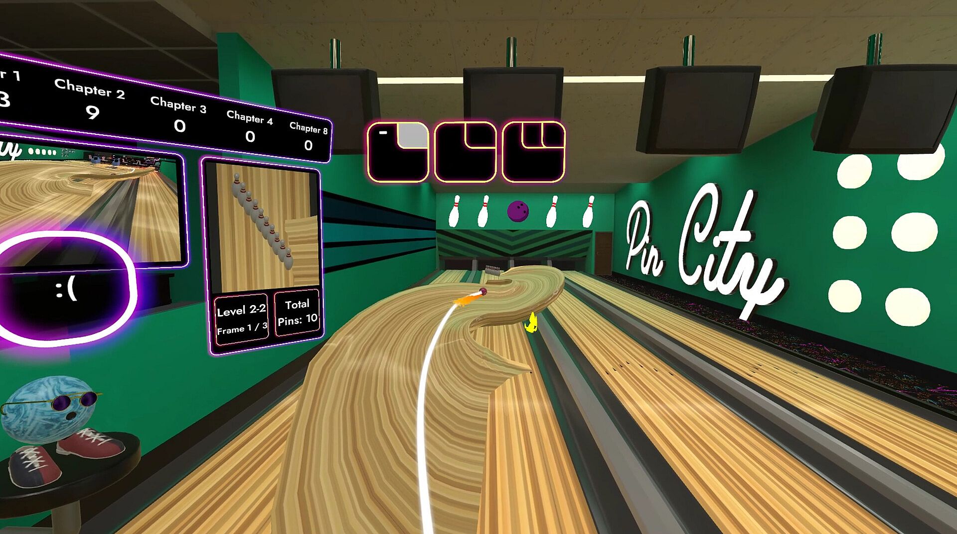 Pin City will have 50+ handcrafted levels spanning a wide range of mechanics to really challenge your bowling arm. The levels are 3 frames each, and are grouped into thematic chapters.