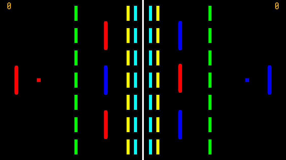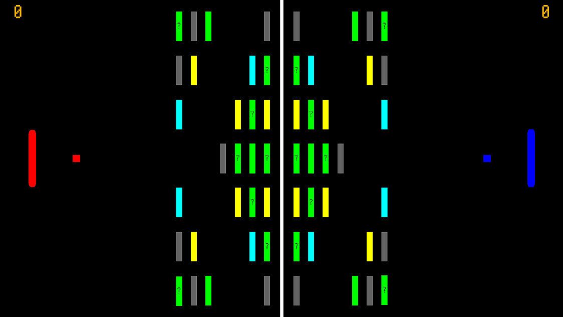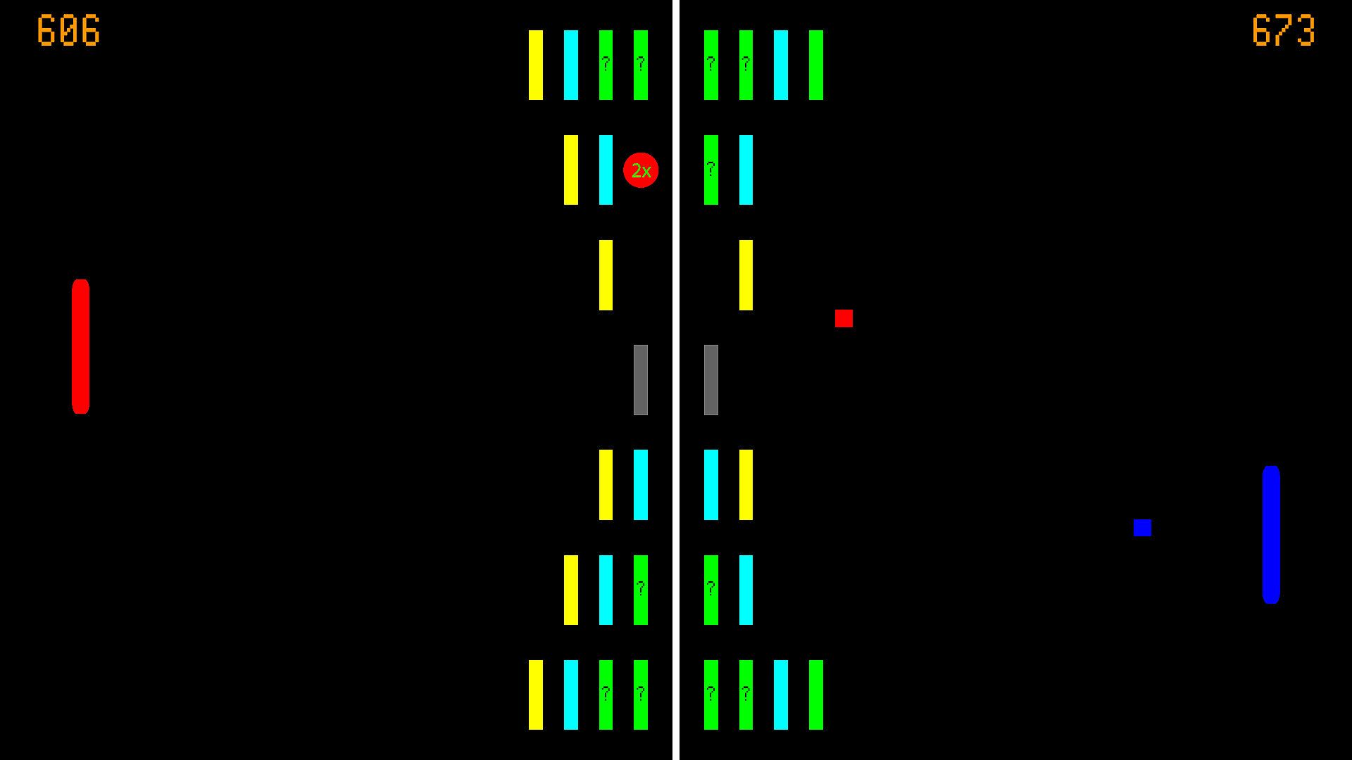 The core loop revolves around directing a ball with your paddle to shatter bricks on the opponent's side while defending your own area. Points accumulate with each successful break or hit, and the first to reach 100 wins the match. Item boxes appear randomly, providing temporary power-ups that add variety. For instance, a multiball effect can release multiple balls for one player, increasing the pressure on the defense. Another item rotates the camera by 90 degrees clockwise, forcing quick adjustments to the new orientation.