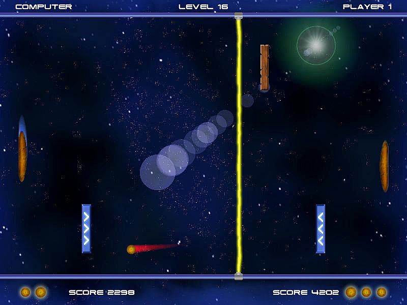 Travel through the expanse of endless space, playing retro tennis with a computer and overcome the many different obstacles that you encounter along the way. The gameplay is essentially a reimagining of air hockey and classic Atari's Pong with new additional elements. The game has new rules; the blocks and mechanisms in the arenas can both help you win and lead you to defeat, and the drop-down bonuses both please and disappoint, it all depends on your dexterity and skills. Complete every level alone or play with your friend in two-player mode. Immerse yourself in a fascinating journey through the cosmic world.