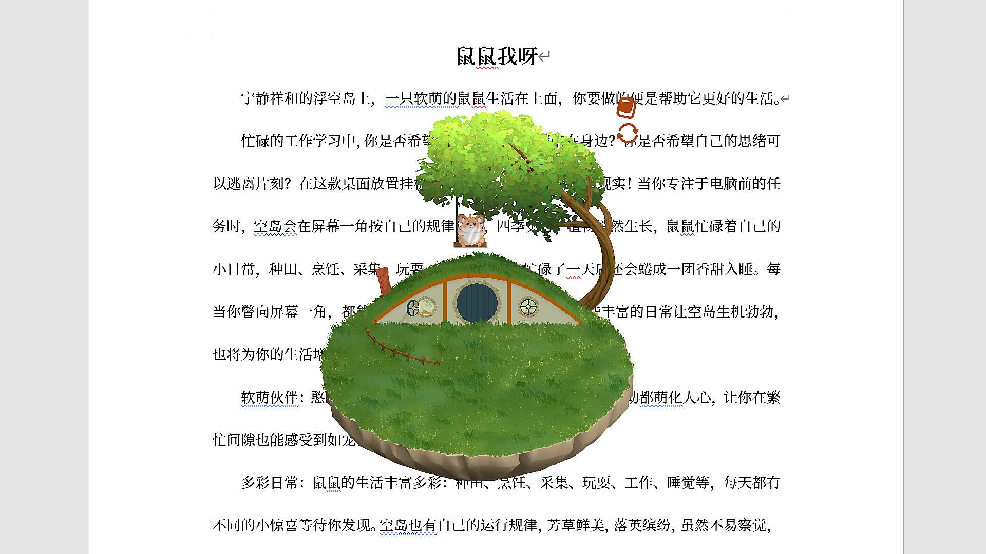 A cuddly companion: A plump, lovable hamster lives on your desktop island. Every tiny movement melts your heart, offering pet-like companionship in your busy moments.