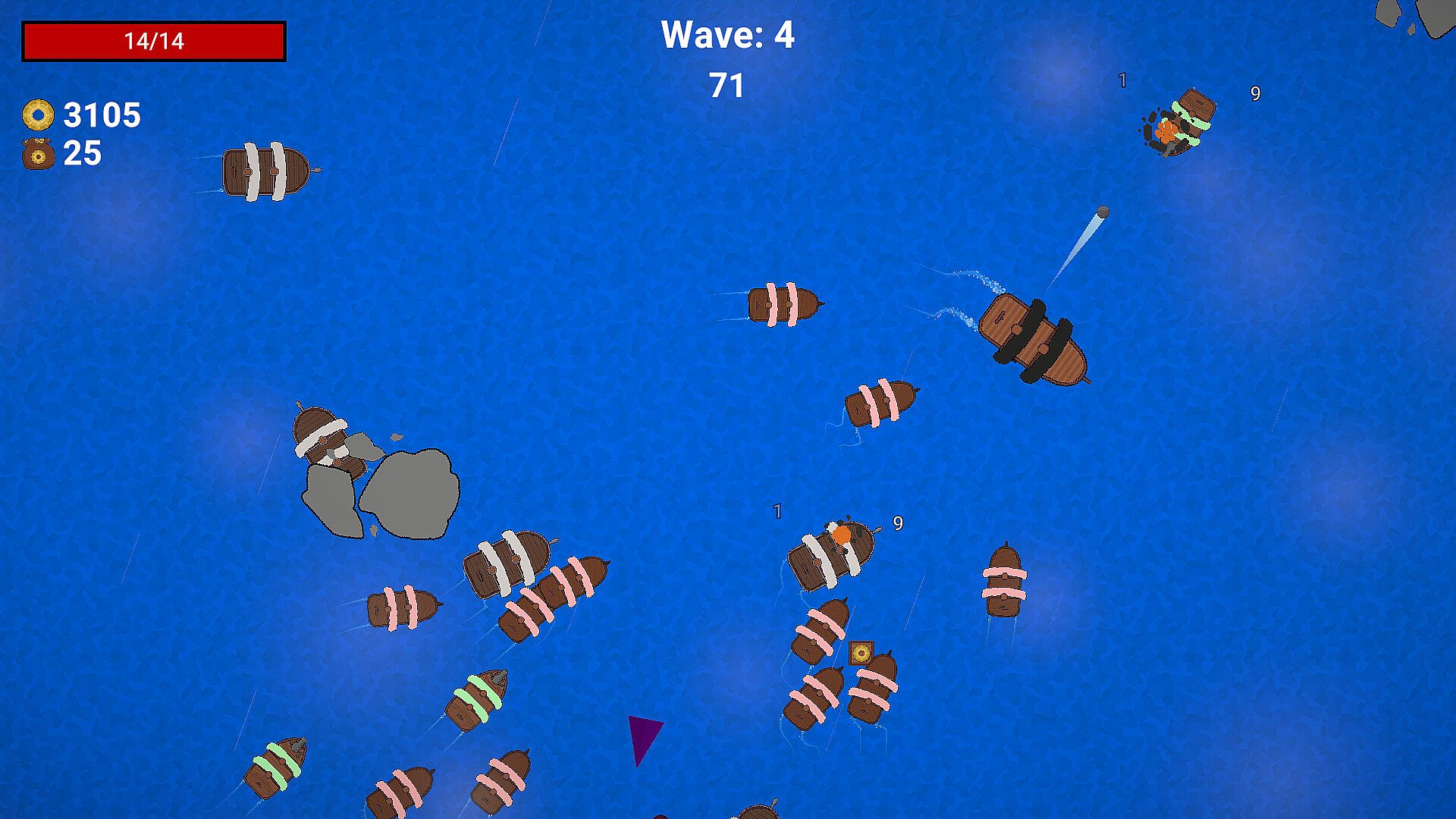 In Pirate Escape, you play as one of several captains and control a pirate ship, trying to survive 15 waves. You can turn your ship left and right, but never stop. Shooting is automatic. When you destroy enemy ships, they drop crates of coins. Between waves, you can buy items in the store or hire crew members.