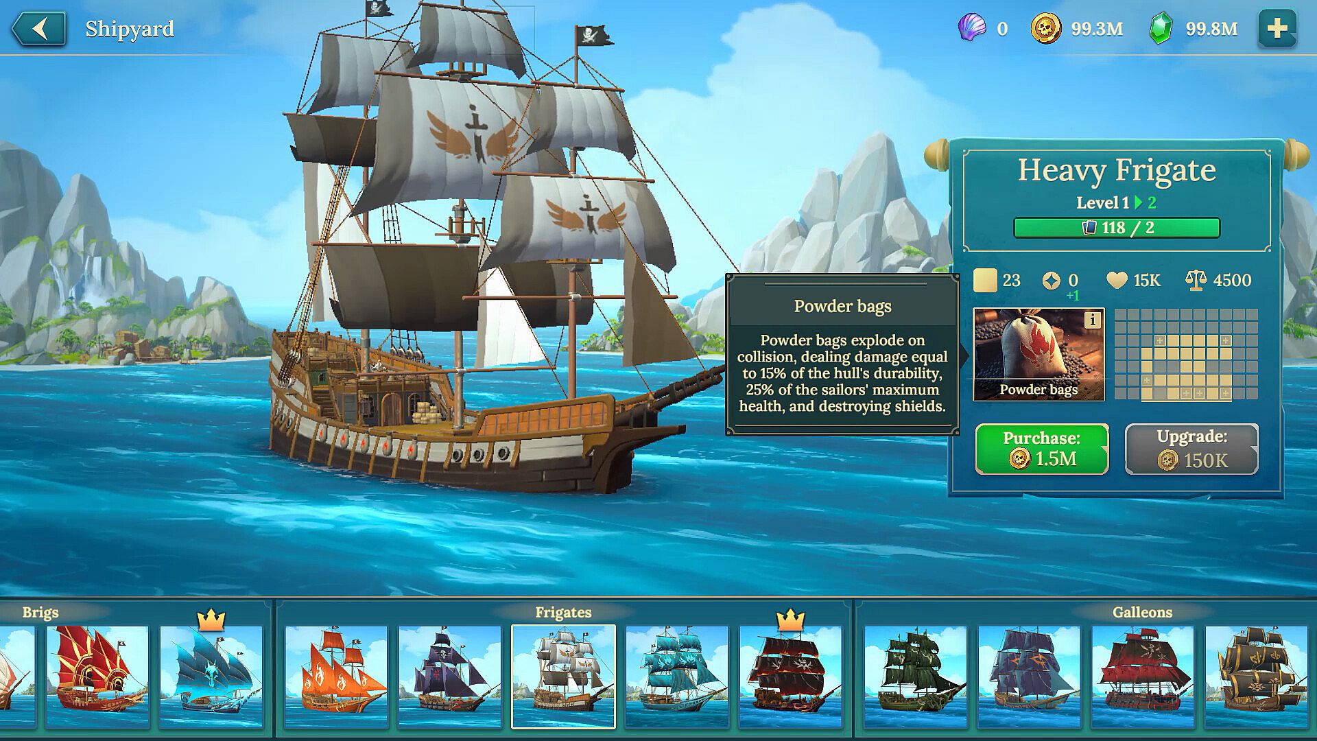 Build ships and equip them with cannons and other stores. Explore over a dozen of various types of ships from schooners to battleships and a huge selection of equipment for modernizing your ship.