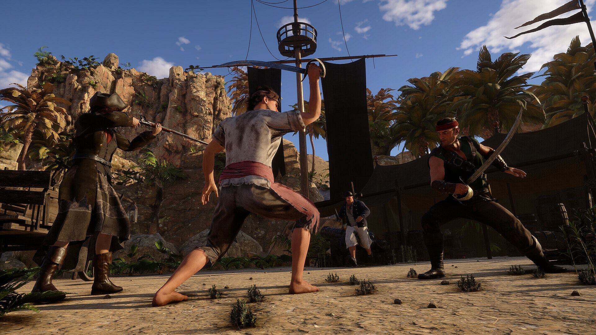 - FIGHT: Engage in visceral hand-to-hand combat, executing precise strikes and defending yourself with a wide variety of weapons like cutlasses and sabers or even improvised armament like a paddle. Enjoy the fluid animations that capture the raw intensity of pirate duels. Parry and dodge to gain the upper hand in close-quarter encounters. Did we mention your trusted pistols yet?