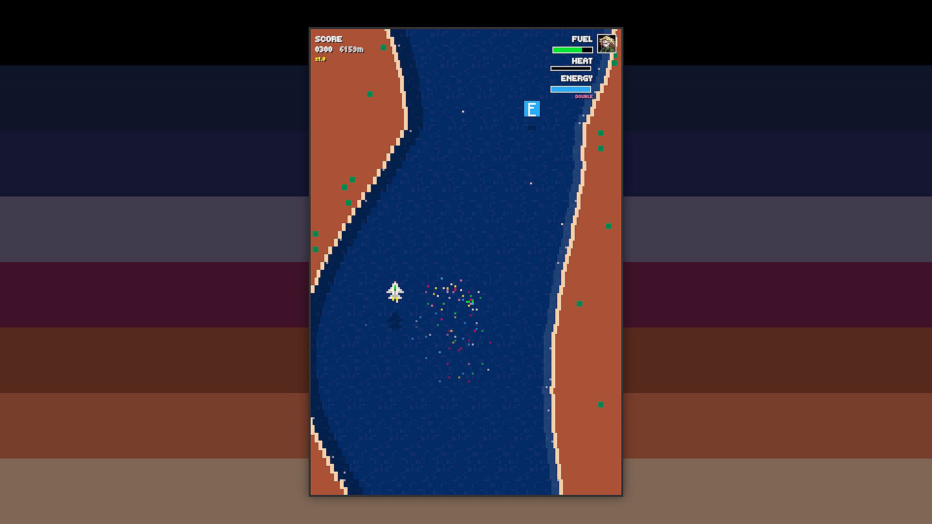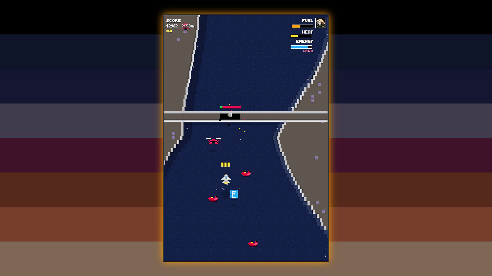 Blast through an endless, procedurally generated river canyon in this retro-style arcade shooter. Manage your fuel, graze enemies for energy, and uncover the story of the "Sky Ghosts" squadron. In Pixel Canyon, the river never ends - but your fuel might.