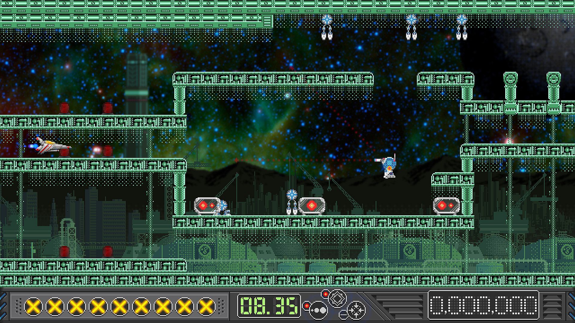 The fight ranges across 50 stages, spanning five environment types: cities, ruins, the asteroid belt, factories, and, if you’re good enough, the enemy headquarters.