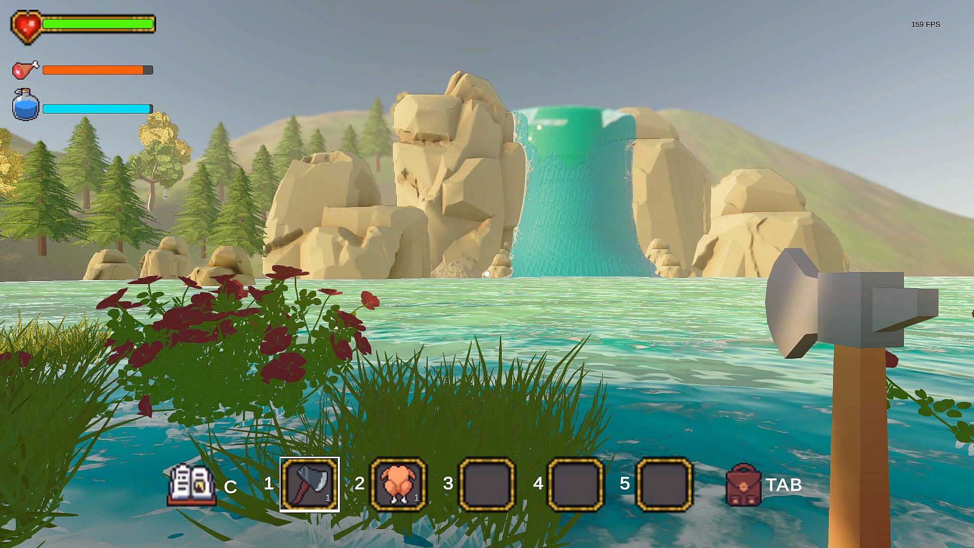 Welcome to "Pixel Horizons," an immersive survival game on a lush, mysterious island filled with dense forests, rolling hills, and stunning scenery. As a stranded adventurer, you must explore this fantastical landscape, gather resources, and craft tools and weapons to thrive in the wilderness.