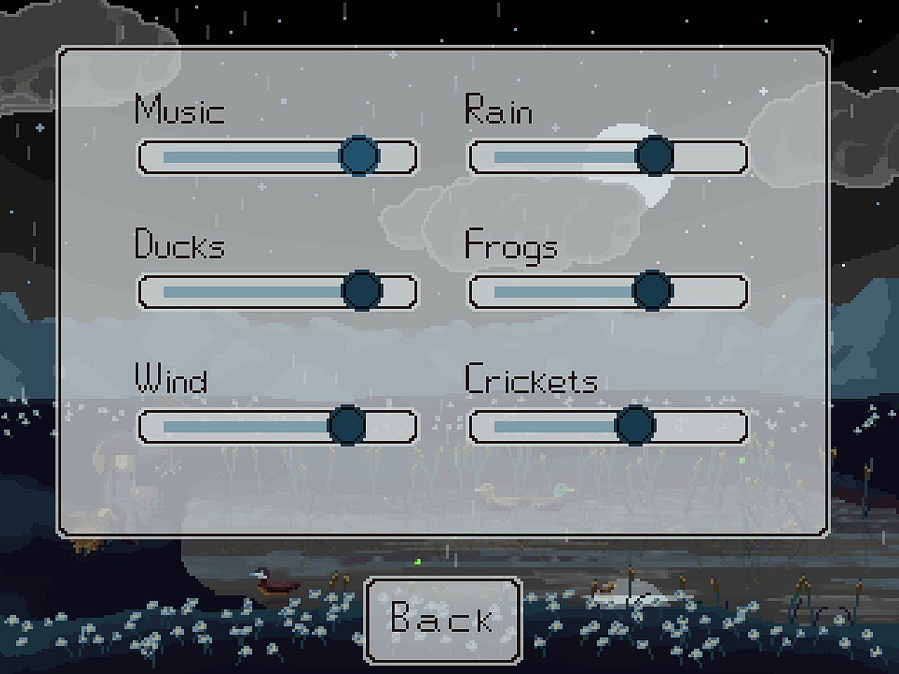 - 5 Mixable Ambient Sounds: Ducks, Wind, Rain, Frogs, Crickets