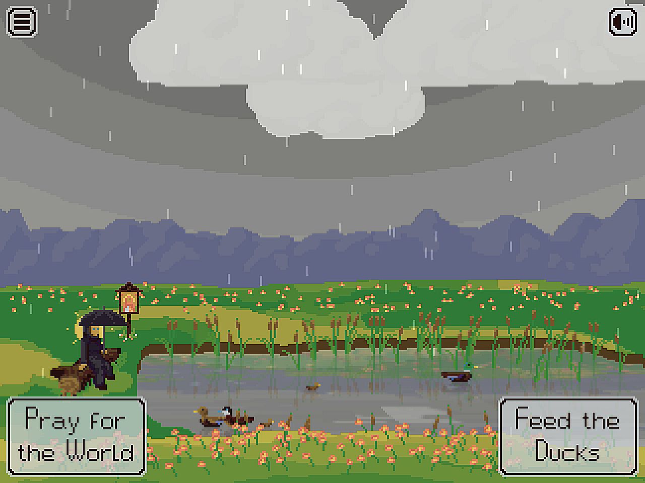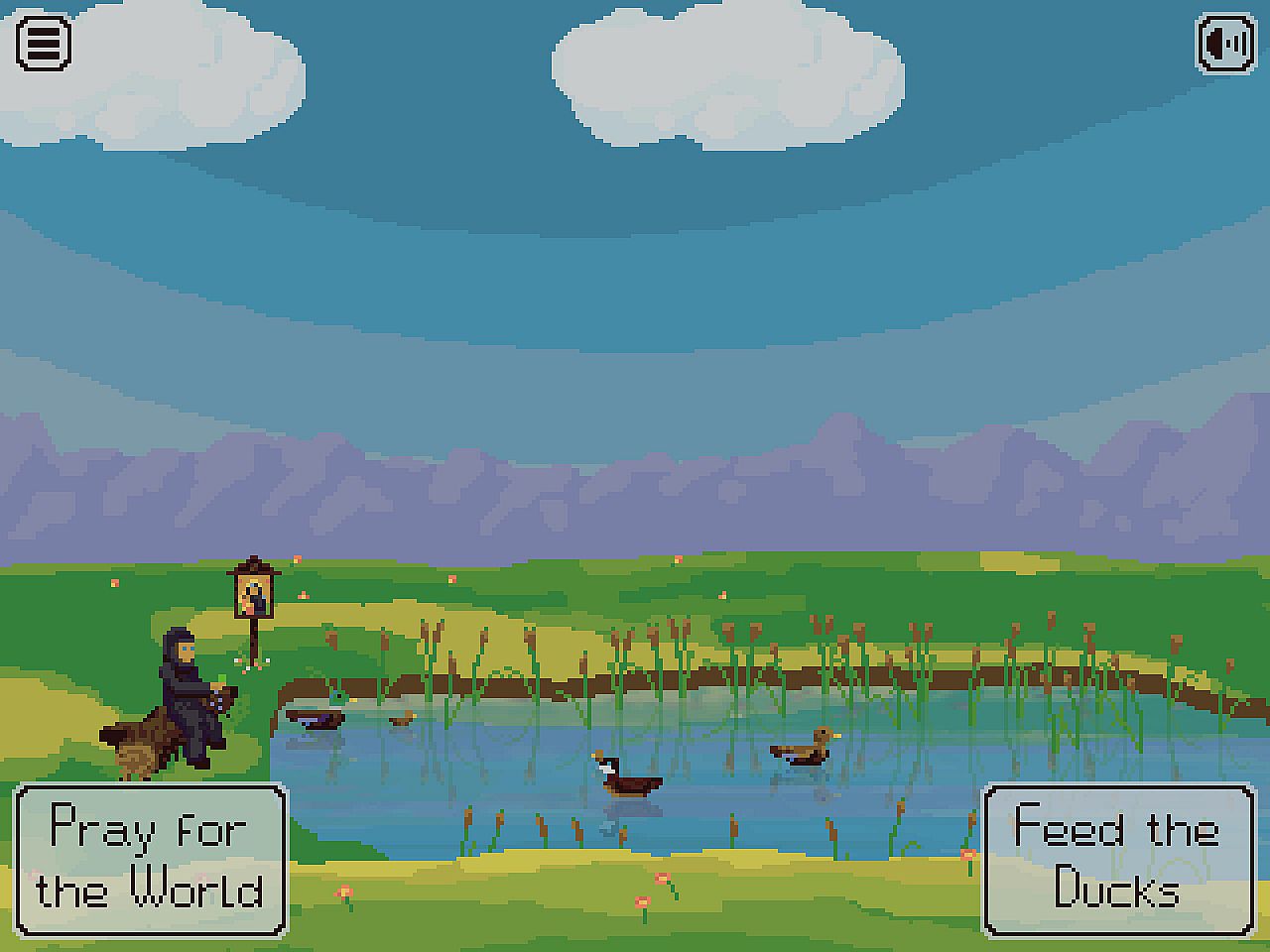 You play as an Orthodox Christian monastic who has gone to their favorite lakeside to pray and feed the ducks. With prayer rope in hand and pocket full of peas (bread is bad for their digestion), humbly quiet your heart while caring for the least of God's creatures.