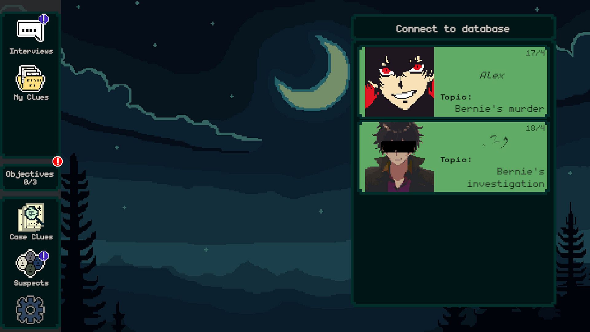 • Interrogation: You can get clues and information about the case by asking your own questions to suspects and witnesses.