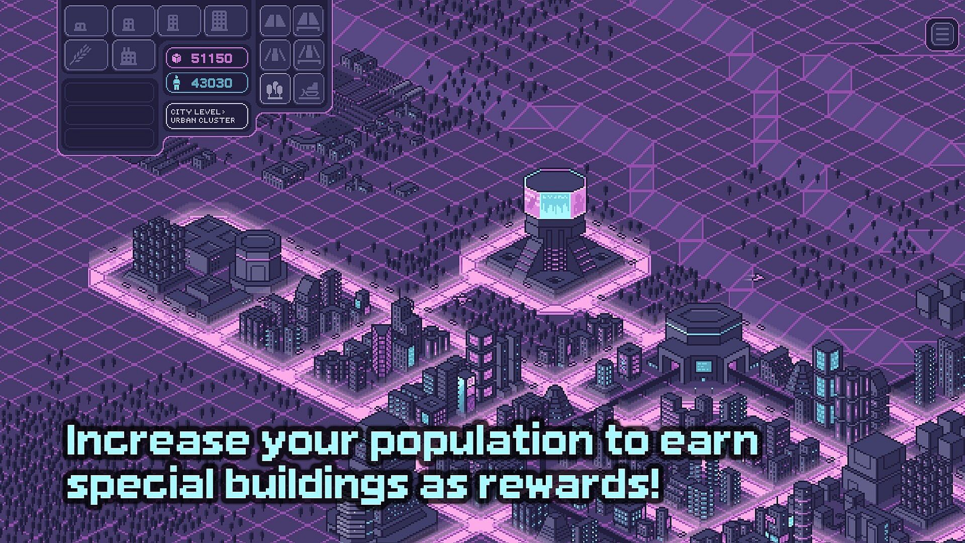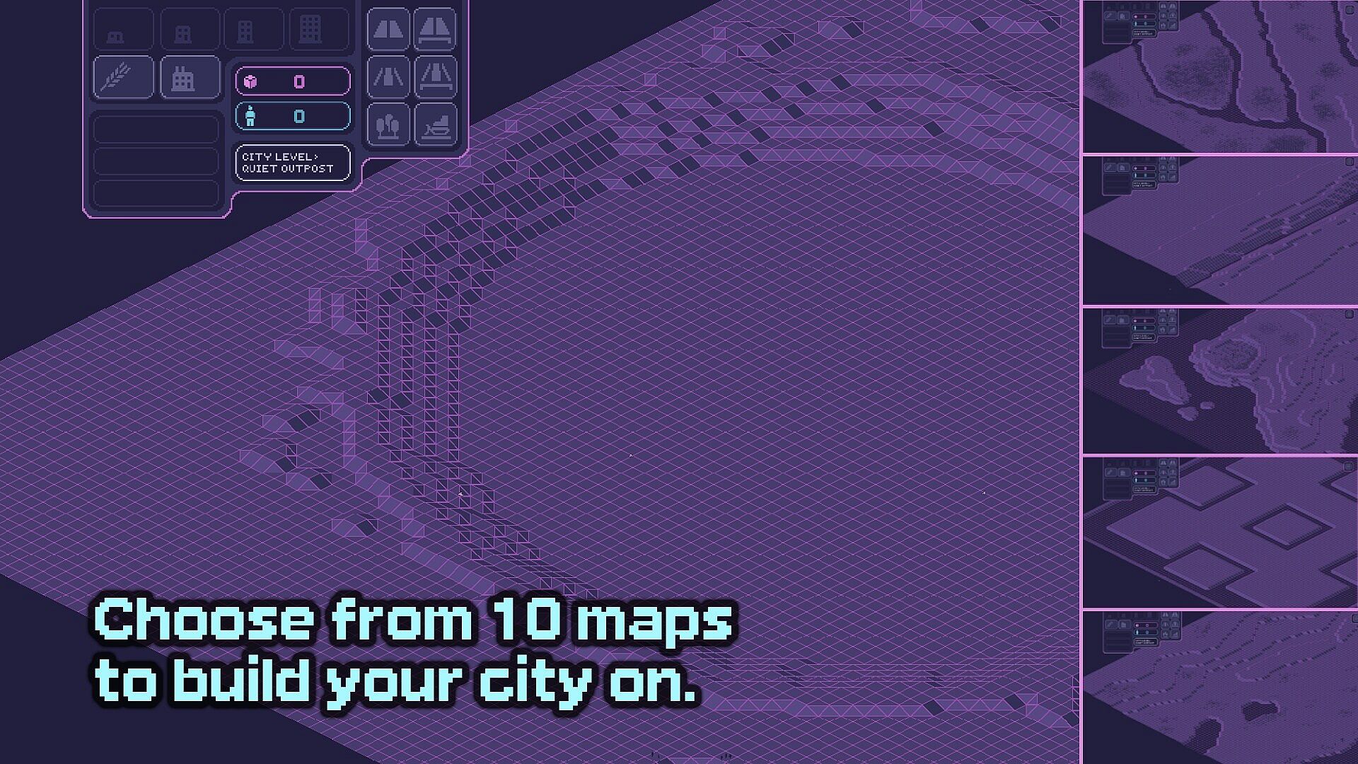 Build across 10 handcrafted maps (100x100 tiles each), each offering a fresh canvas for your ideas. With more than 400 unique buildings, all lovingly drawn by hand — no AI shortcuts here — you can design dazzling skylines, bustling districts, and neon-soaked streets that feel alive.
