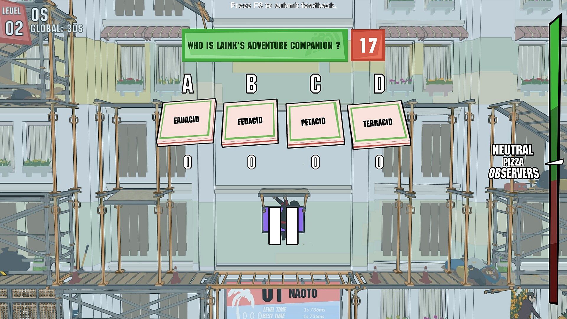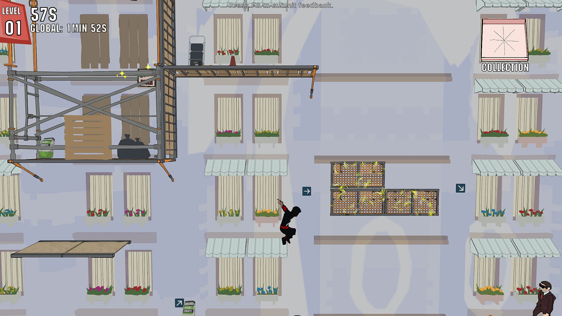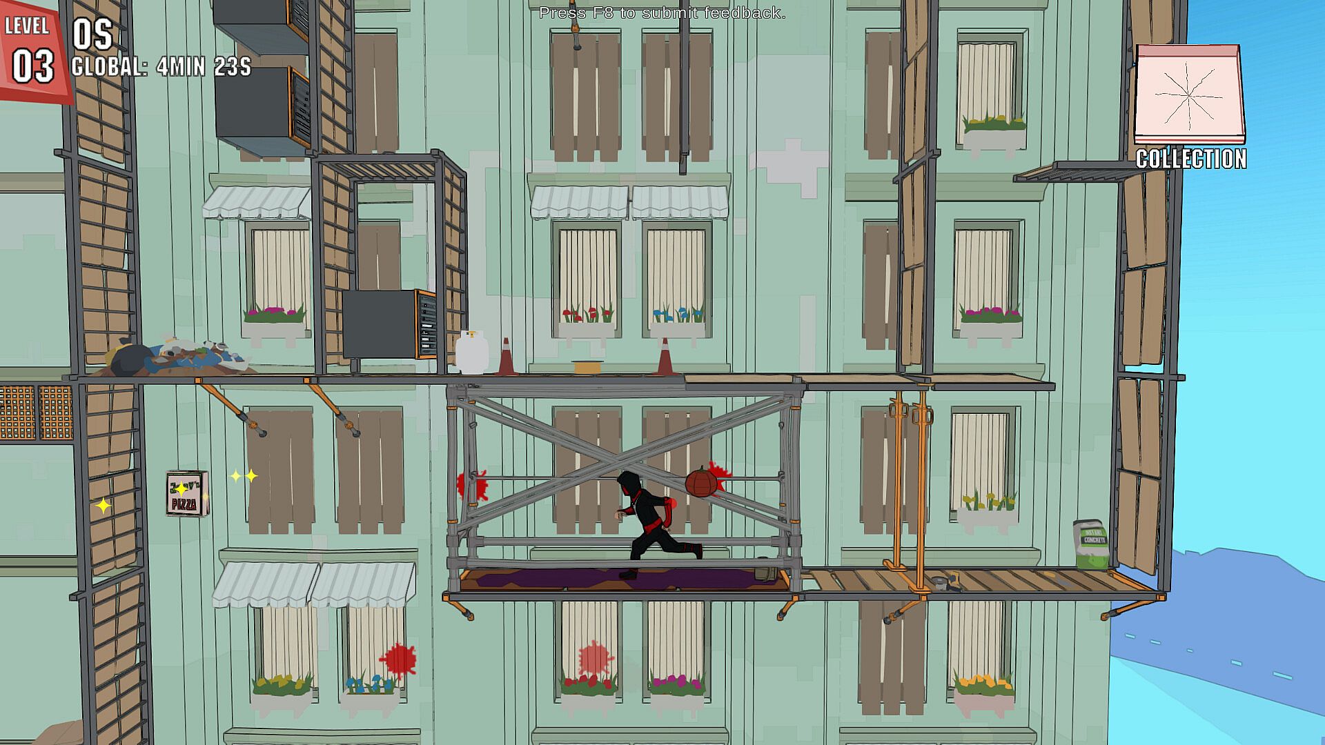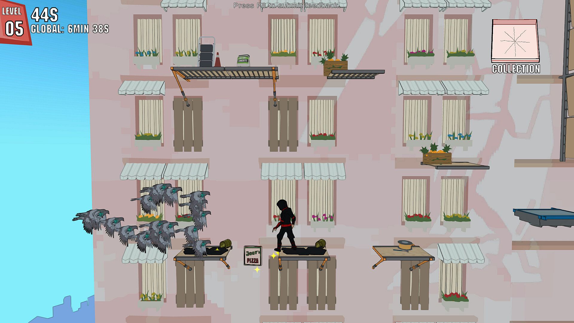 Pizzaïolo-Ninja is the only 'Die & Retry' platformer where you never actually die… but you take some spectacular falls! And of course, the higher you fall from, the more it hurts (your ego, mostly) and the saltier salty people will get!