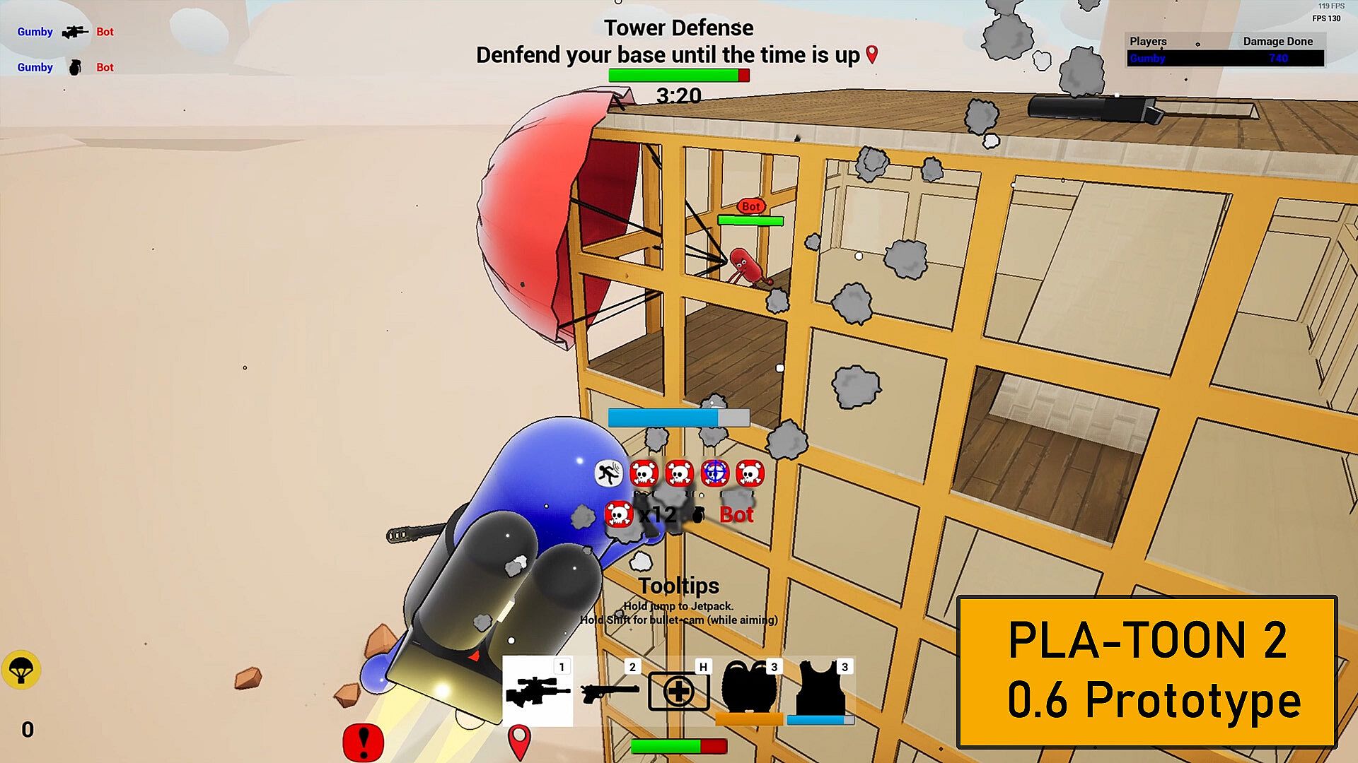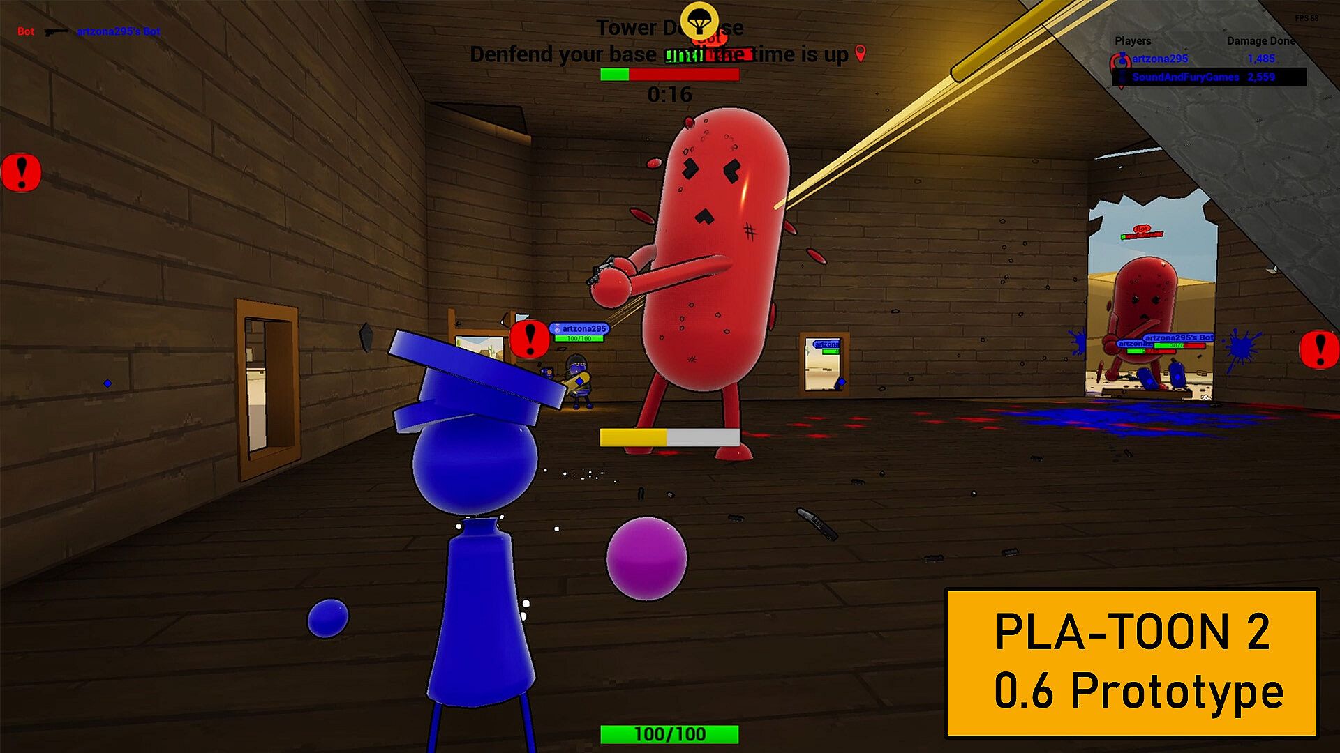 Players start in a lobby where they vote on what level and game mode to play. After the round ends, they return to the lobby. Game modes include Arena, Base Defense, Battle Royale, Deathmatch, and Team Deathmatch.