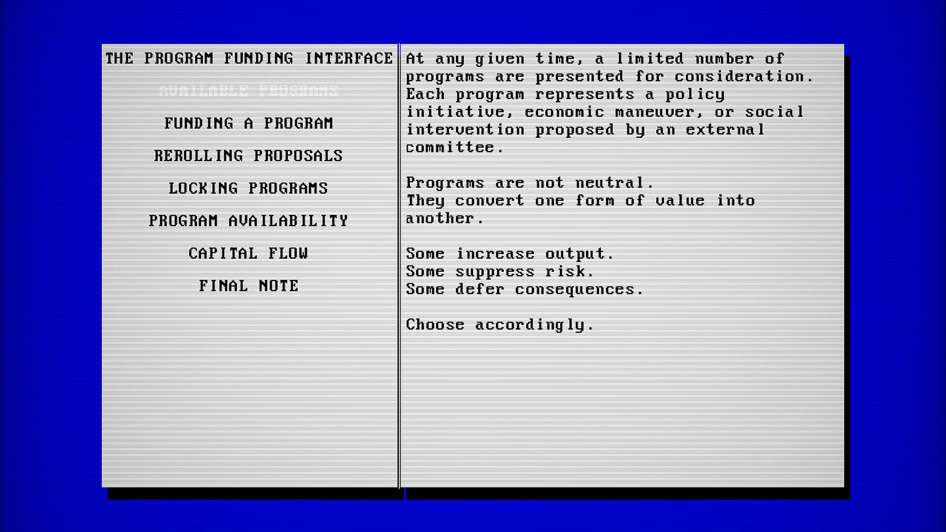 Fund programs that bend the rules of the simulation. Expand agriculture. Manipulate infrastructure. Regulate - or deregulate.