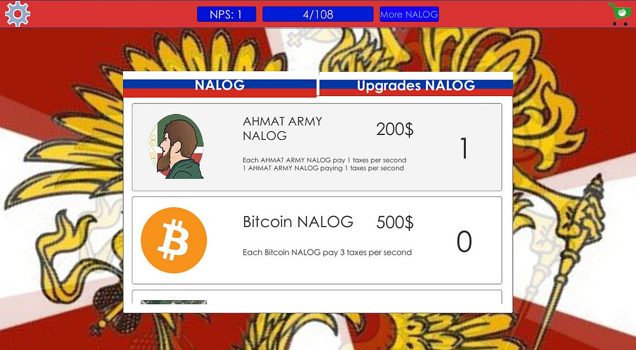 This is a simple comic clicker, in which you have to play on behalf of the Russian. You interact with the president and pay taxes. The more you do it, the more taxes you pay. In this game there are analogs of already existing taxes in Russia, as well as those that will only appear in the country.