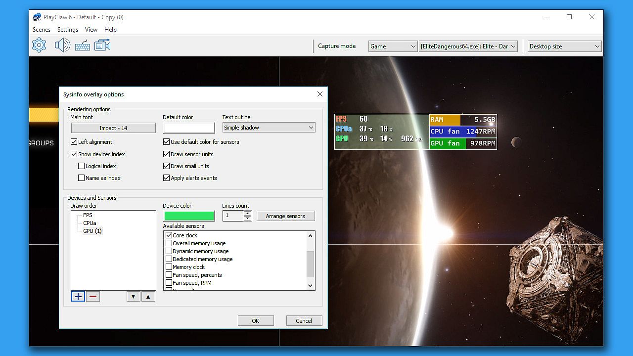 • Very flexible System information overlay (GPU, CPU, RAM, HDD, FPS, Network sensors)