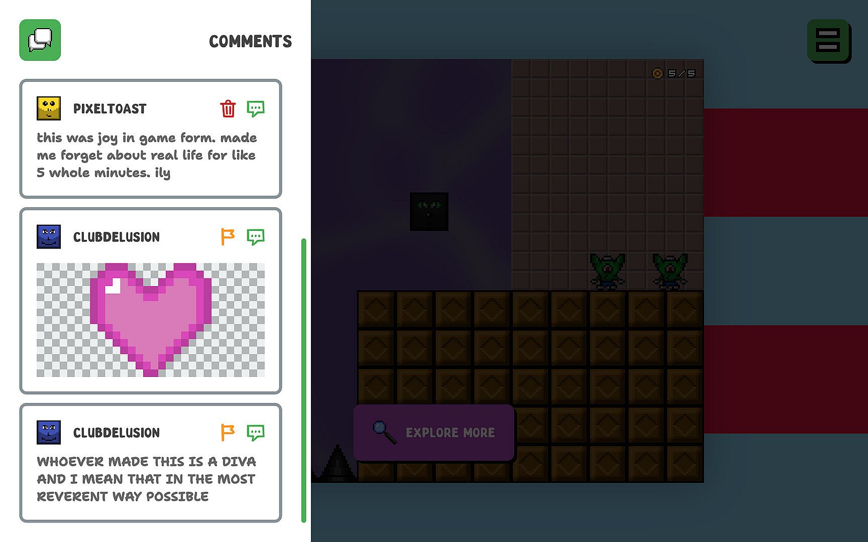 Share your games with the community, discover creations from players around the world, leave comments, show love with likes, and make new friends.