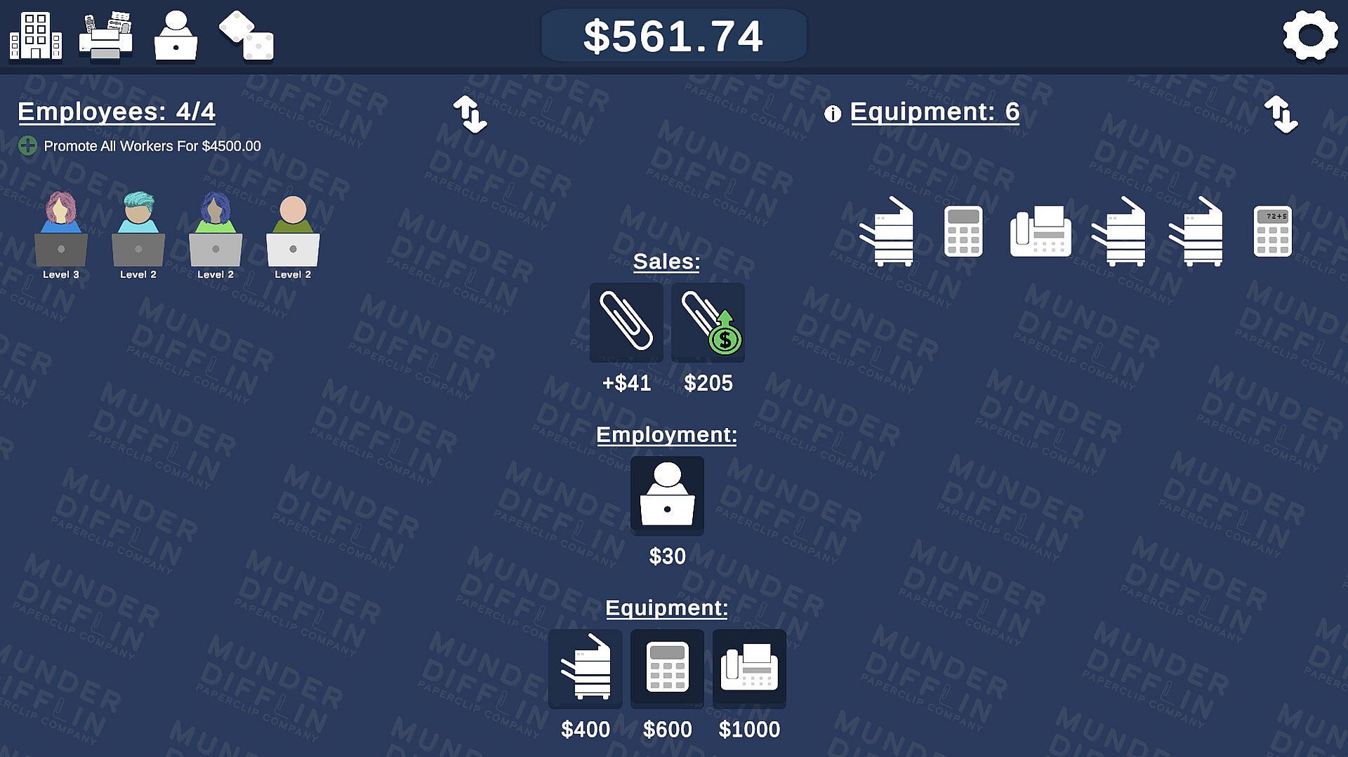 Start your journey at the Munder Difflin Paperclip Company, where success is simple: click the button, make money, and watch the numbers go up. Hire employees. Buy upgrades. Improve working conditions. All the while, corporate assures you that everything is running perfectly.