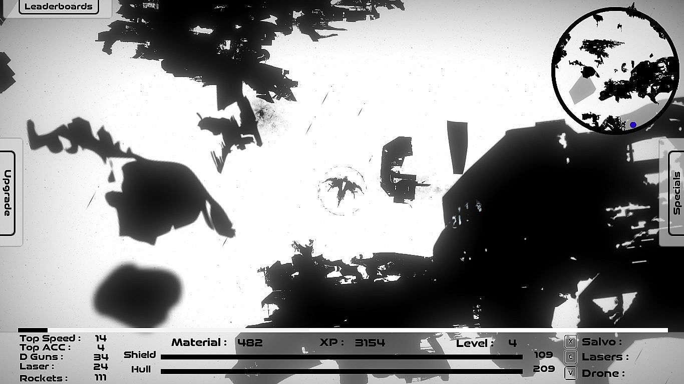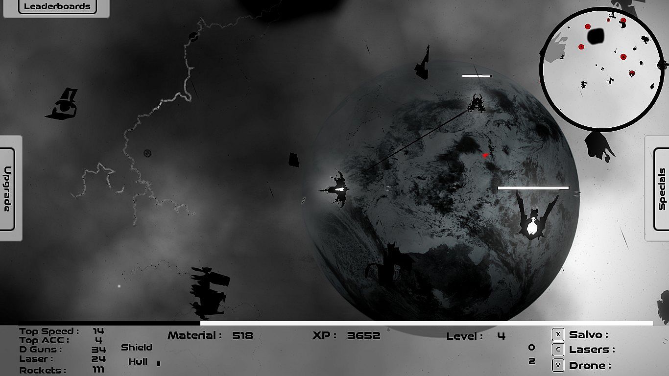 is a top-down 2D action game in science fiction genre. The player's role is to assist the allied alien race in liberating our solar system. The player collects experience points and material points, which he gains by destroying enemy units and asteroids in the solar system, and subsequently upgrades the spaceship and uses special weapons. By combining his abilities and the options offered, the player moves further in the game. Levels are designed and processed according to a story that is written and narrated between levels.Top-down shooters essentially exists but not in black and white as Limbo or another monochromatic games. It will be the first 2D sci fi shooter with such a monochrome graphic design, a partial open world and a simple narrative story.