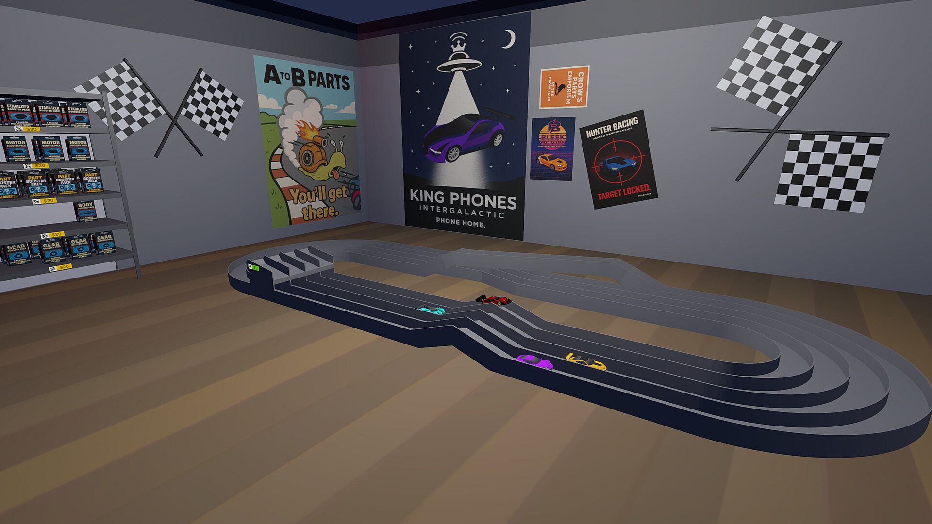 Invite friends to your shop or go visit theirs where you can buy parts, check out shop designs, or join in a race.