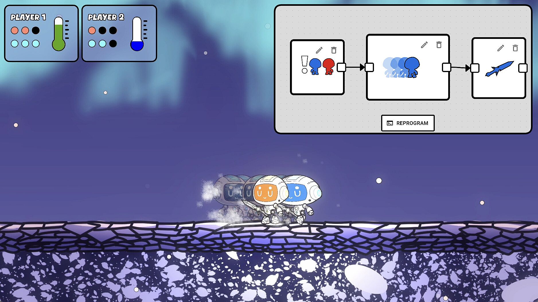 Use trigger cards such as Enemy or Wall and action cards such as Dash, Attack or Jump to beat your enemies !