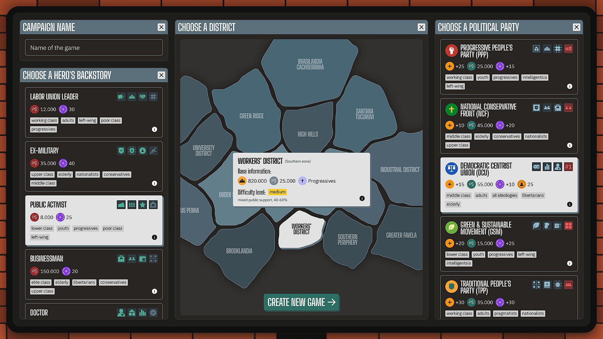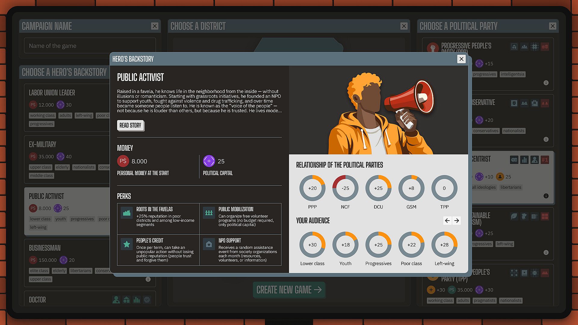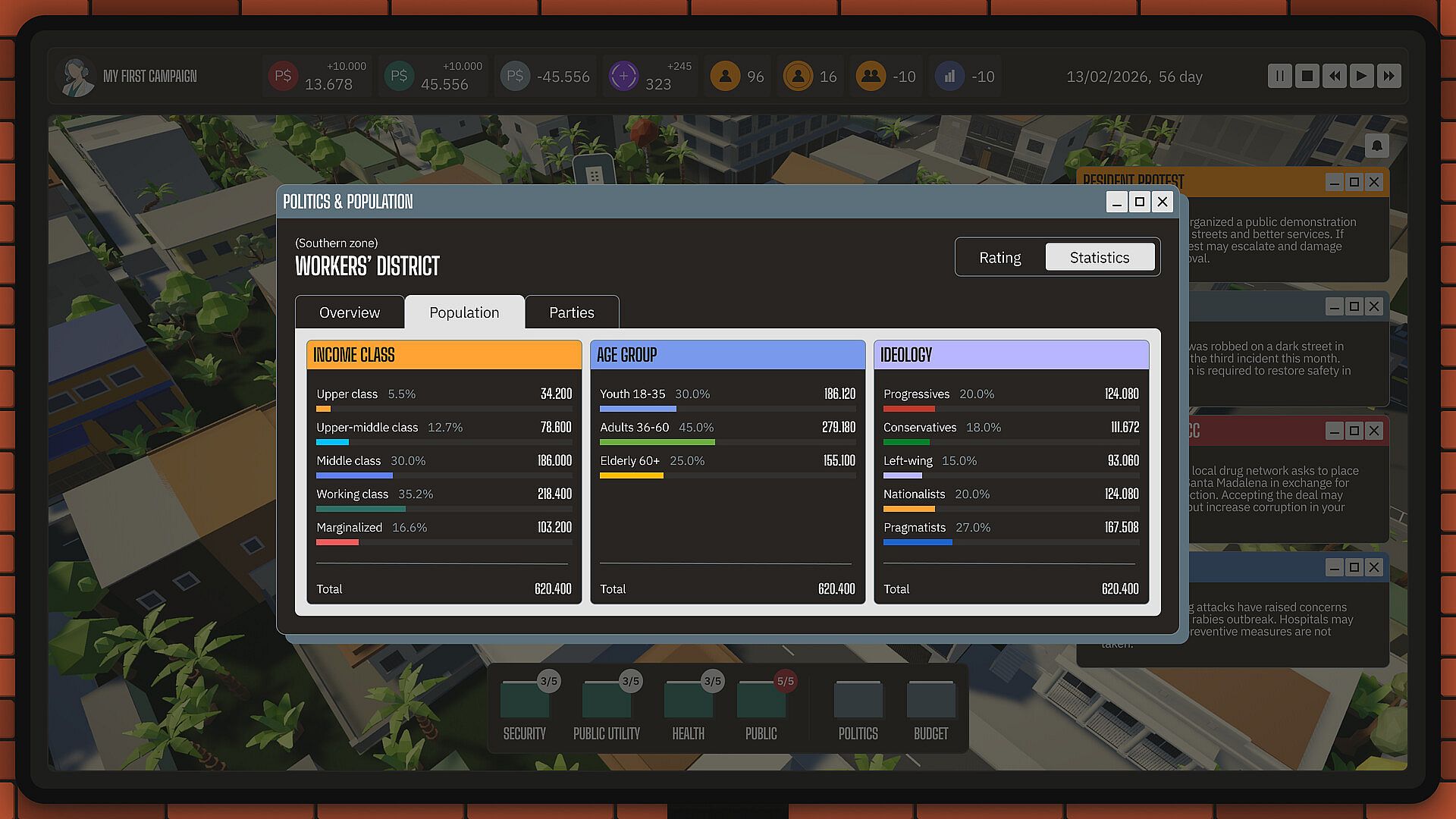 You are a district manager in a Latin American megacity. 12 million people, five political parties, 5 backstories, 75 population groups. Party leadership reminds you who put you in that chair. Business elites expect favorable decisions. The people demand justice. And your rivals are counting the days until you slip up.