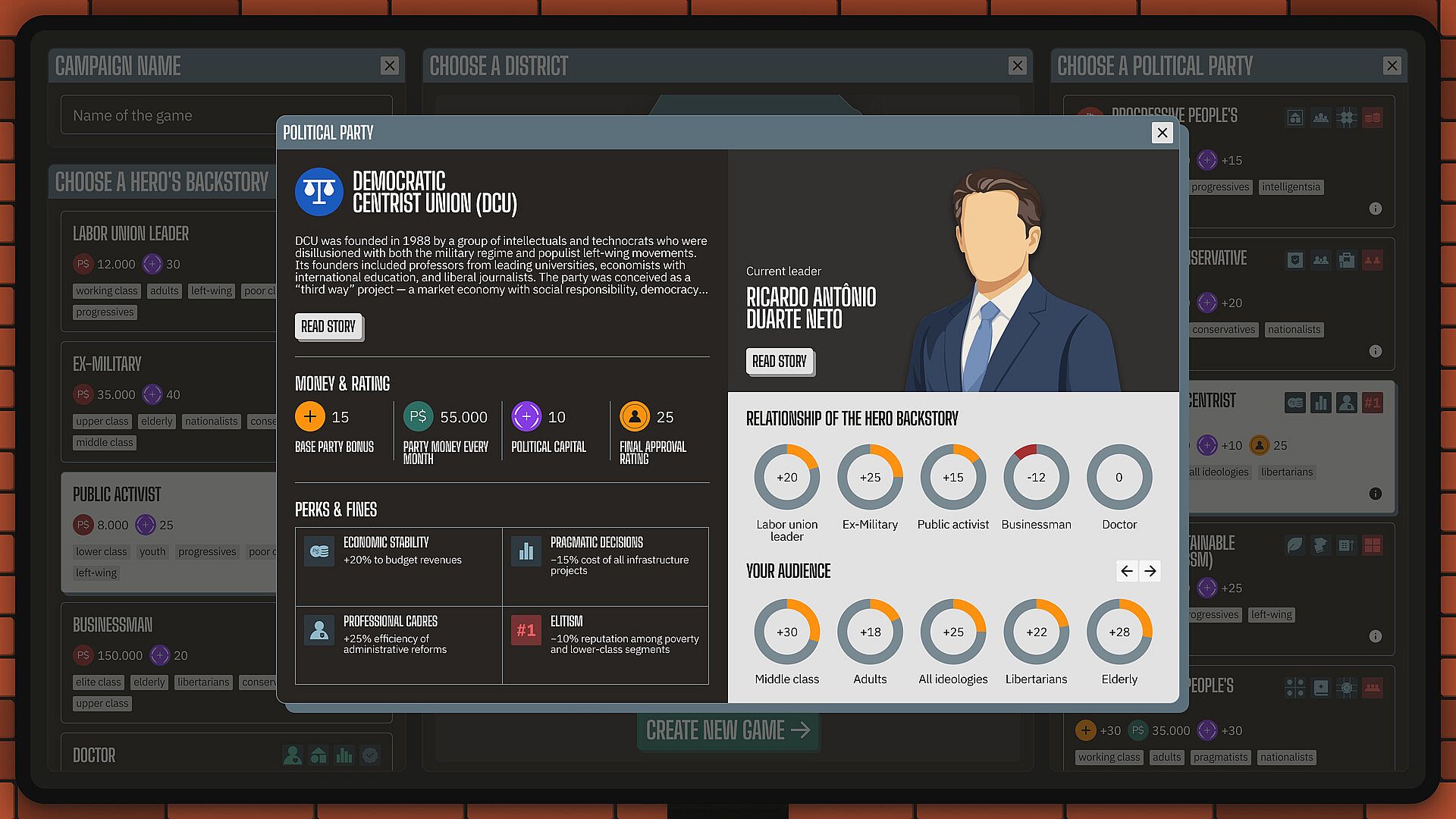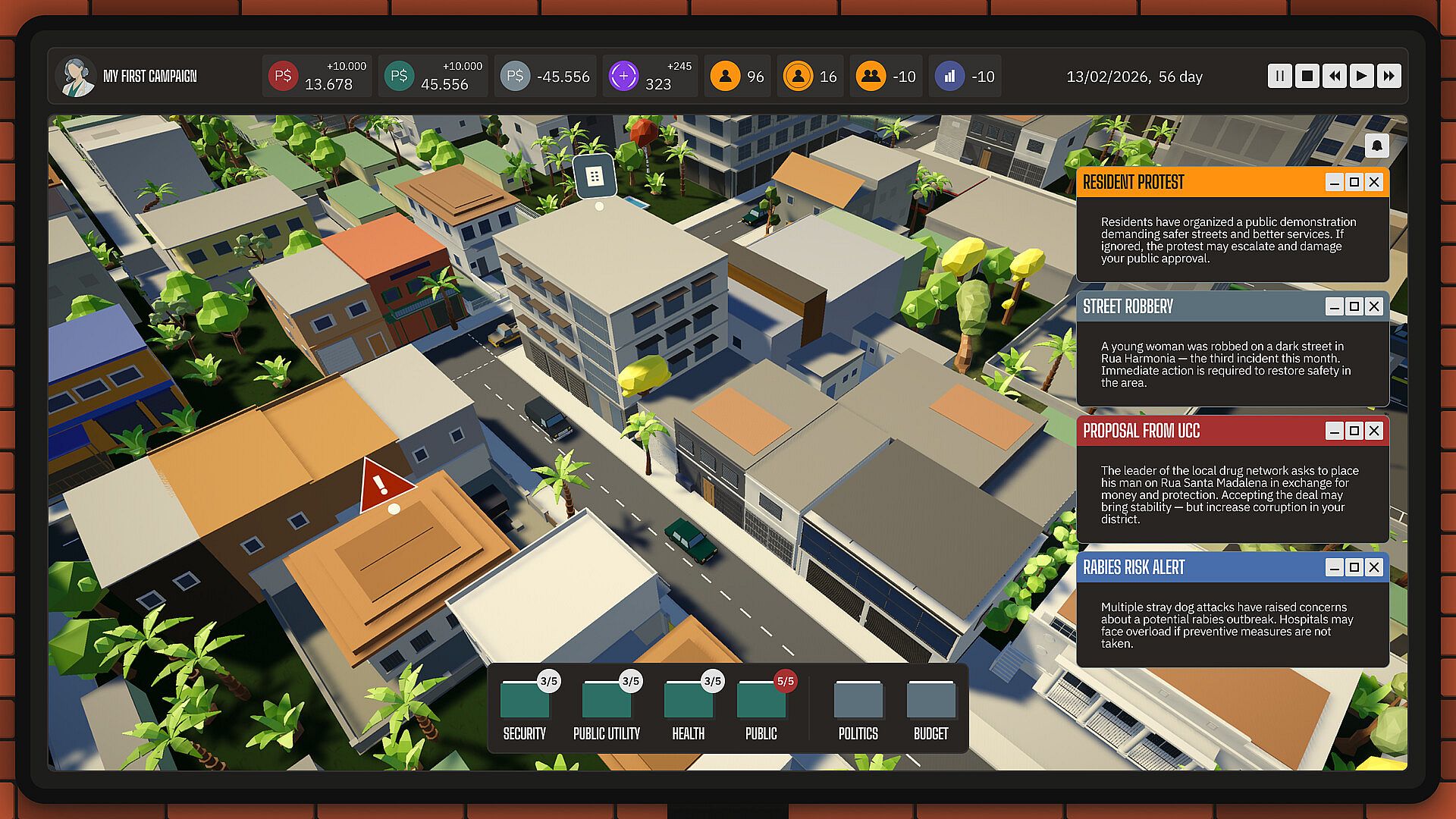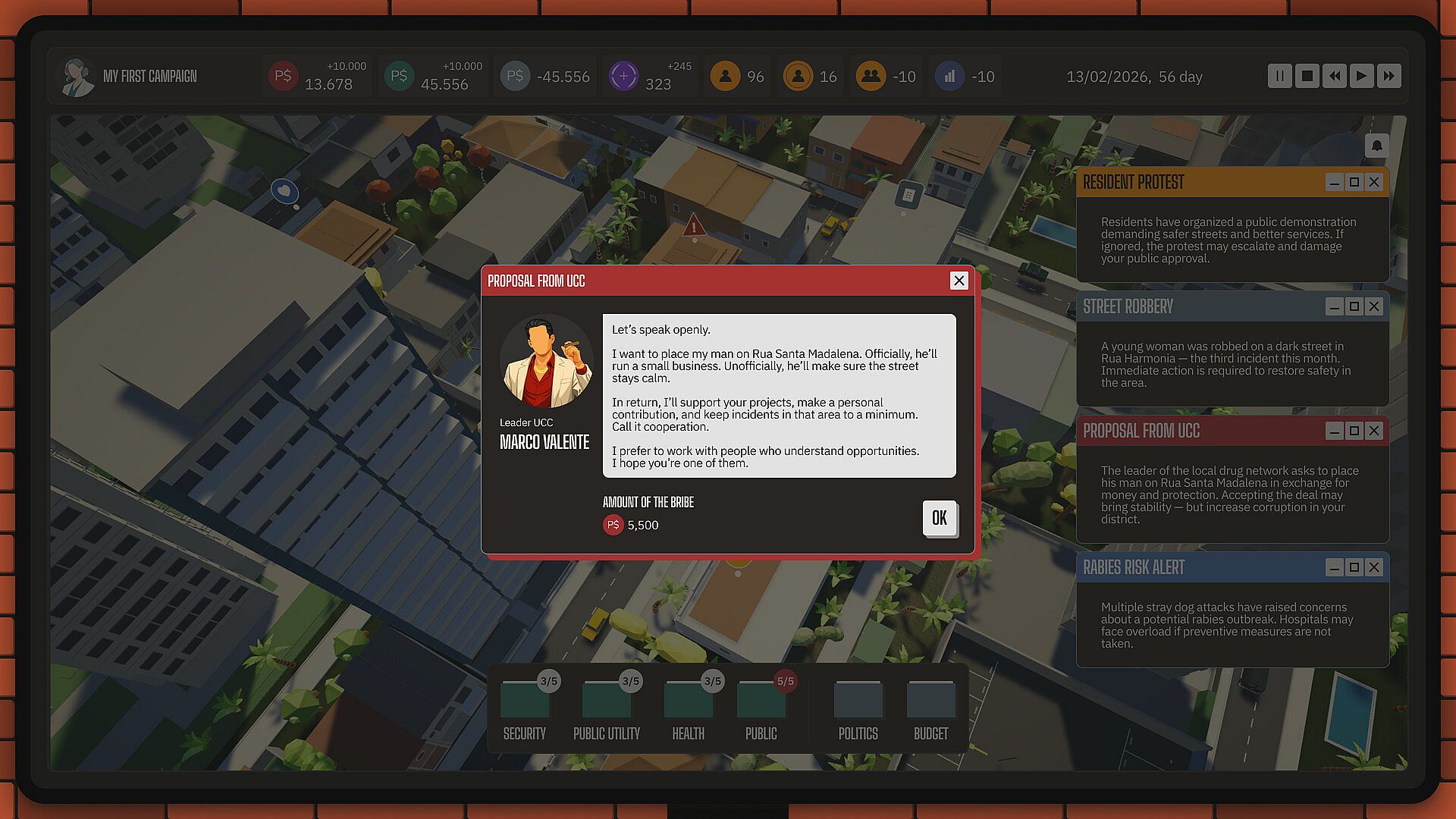 You are a district manager in a Latin American megacity. 12 million people, five political parties, 5 backstories, 75 population groups. Party leadership reminds you who put you in that chair. Business elites expect favorable decisions. The people demand justice. And your rivals are counting the days until you slip up.
