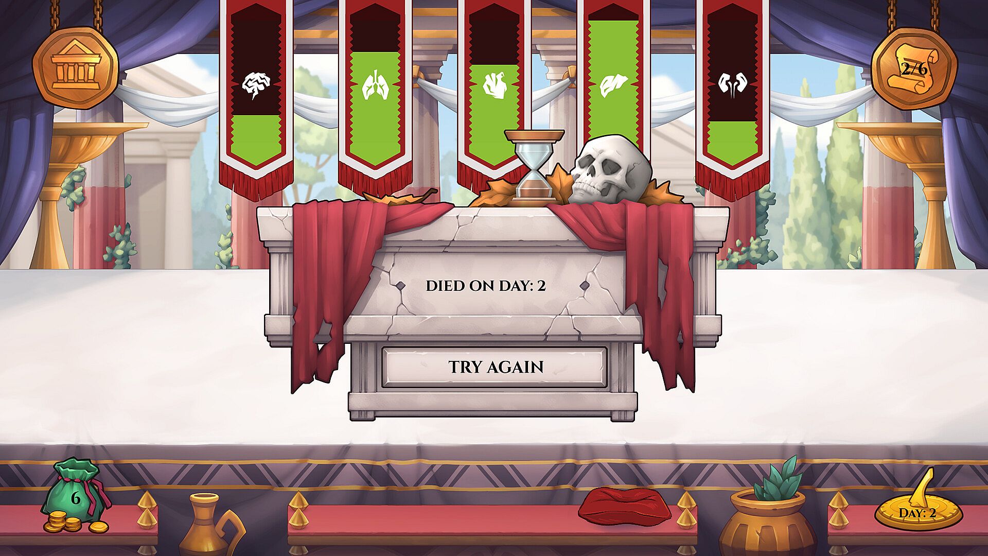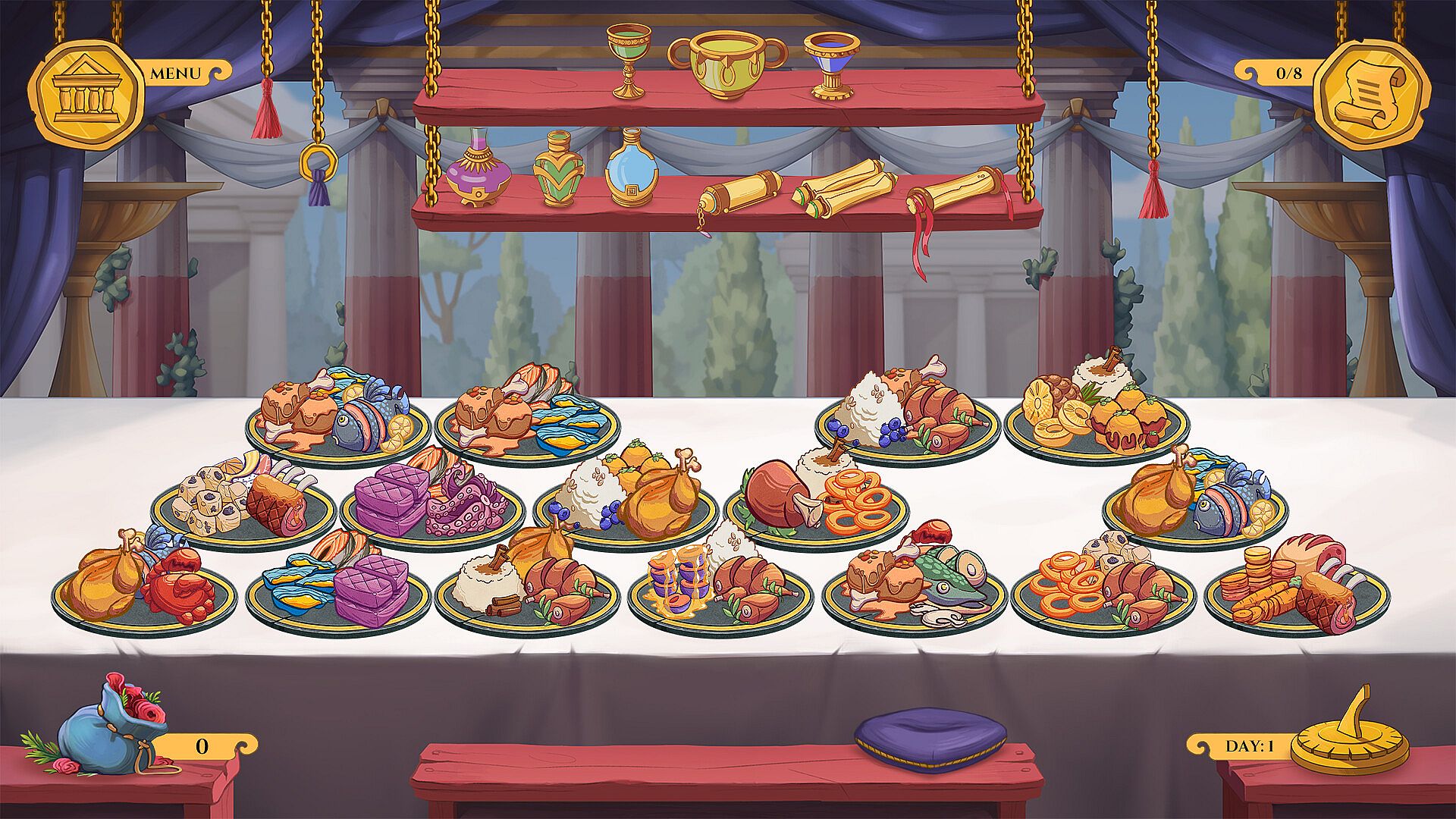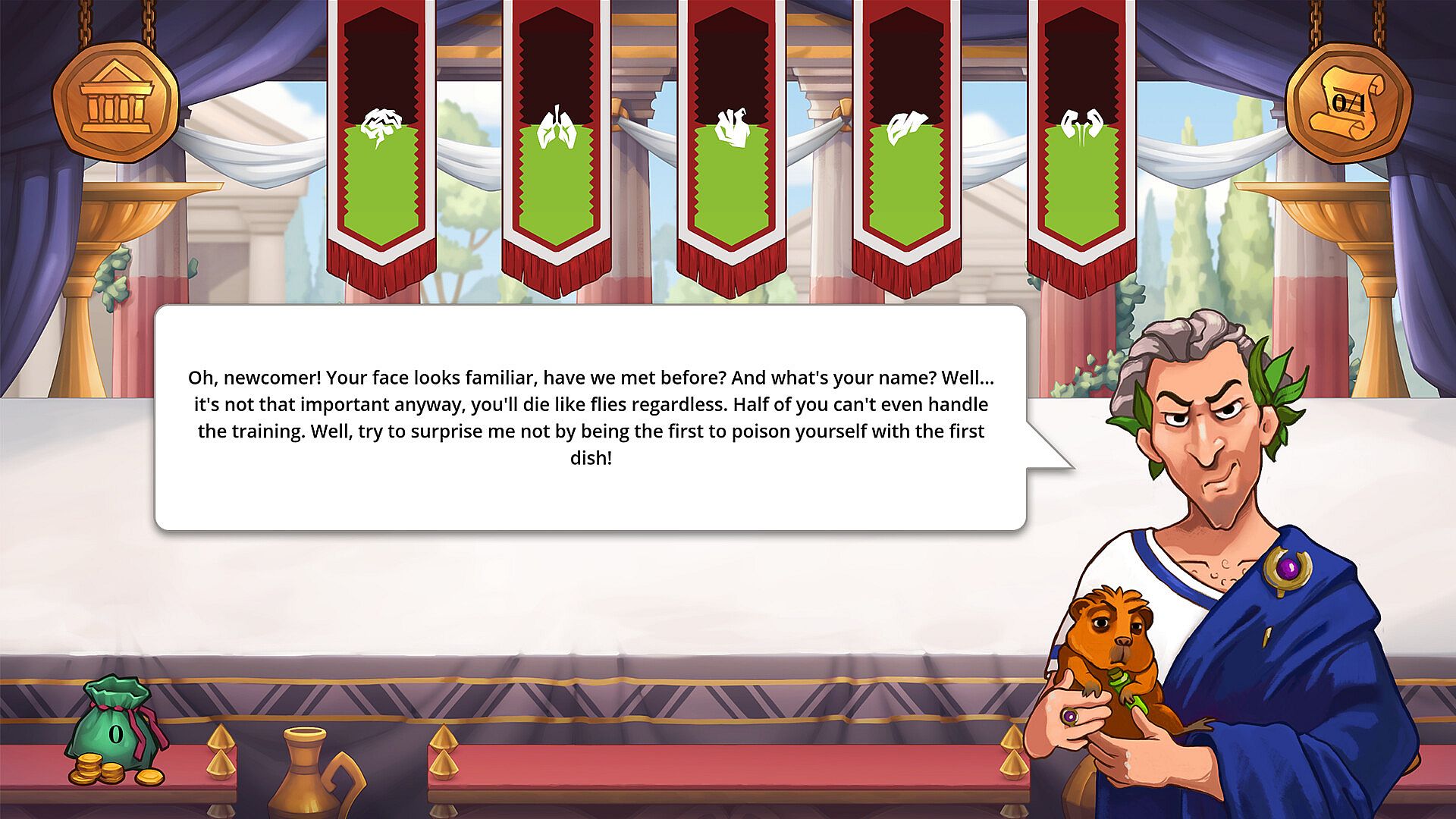 Poison is Served! - a cozy balancing puzzle with management elements and satiric narrative. You play an ancient roman food taster who works in the Emperor's palace. Every day you need to taste poisoned food, analyze how it affects your health, plan the order of tasting and try to survive at the end of day.