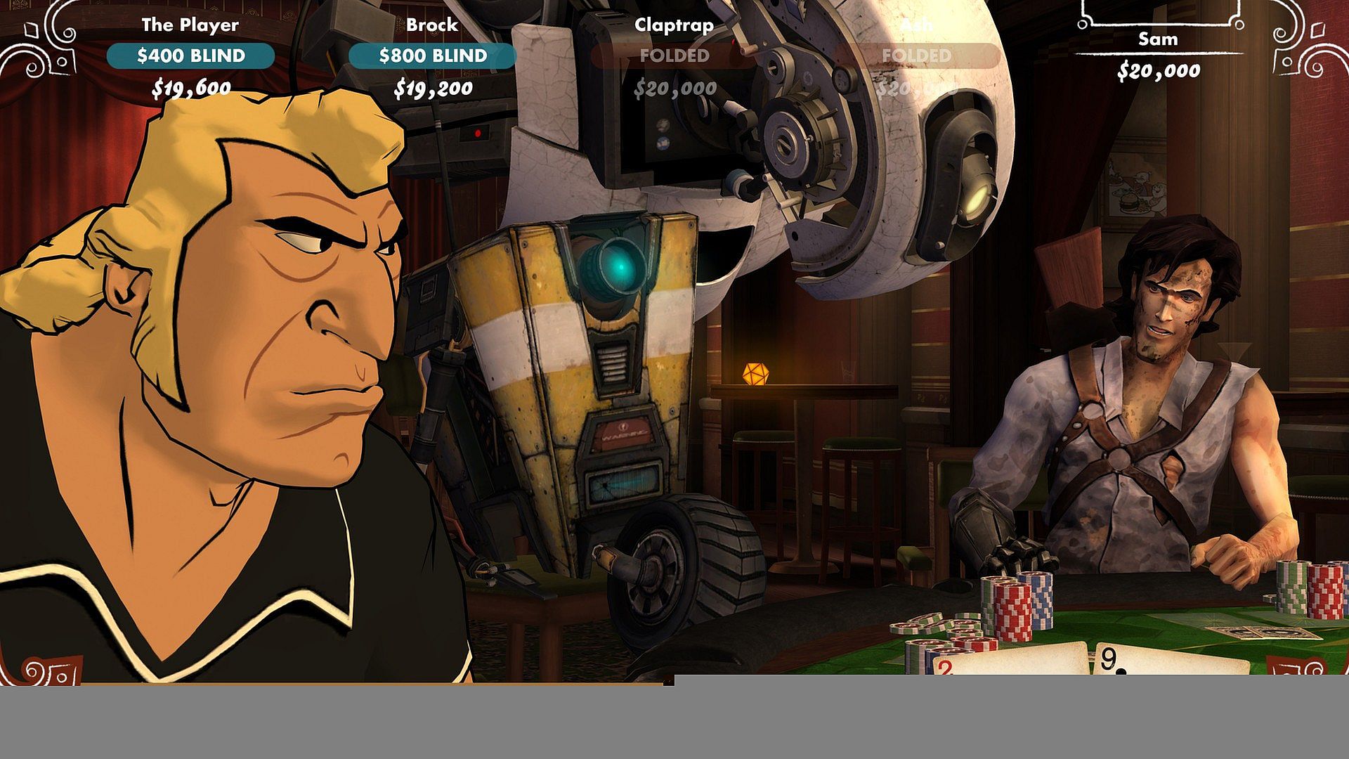 The chips are down and the ante is up in this sentence already bursting with poker clichés! Take the fifth seat in Poker Night 2, at a table featuring Claptrap (Borderlands 2), Brock Samson (The Venture Bros.), Ash (Army of Darkness) and Sam (Sam and Max series). Play to unlock new Team Fortress 2 items and win unique skins and heads for Borderlands 2! Your dealer is GLaDOS (Portal series), but at no point will you be considered as a candidate for a visit to Aperture Science’s Enrichment Center. Unless you lose.