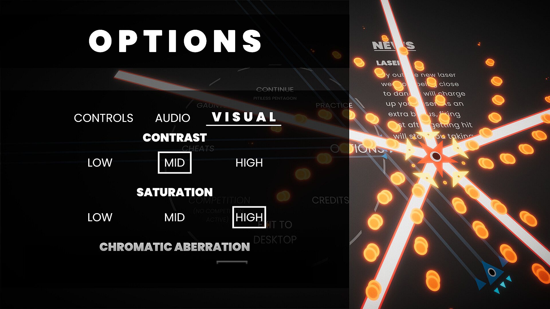 Inspired by the likes of Tempest, Geometry Wars and Just Shapes & Beats, this modern shmup aims to strip back the complex, busy art style of classic shoot-em-ups. The minimalistic art style makes enemy bullet patterns much clearer and easier to focus on, if not easier to actually dodge