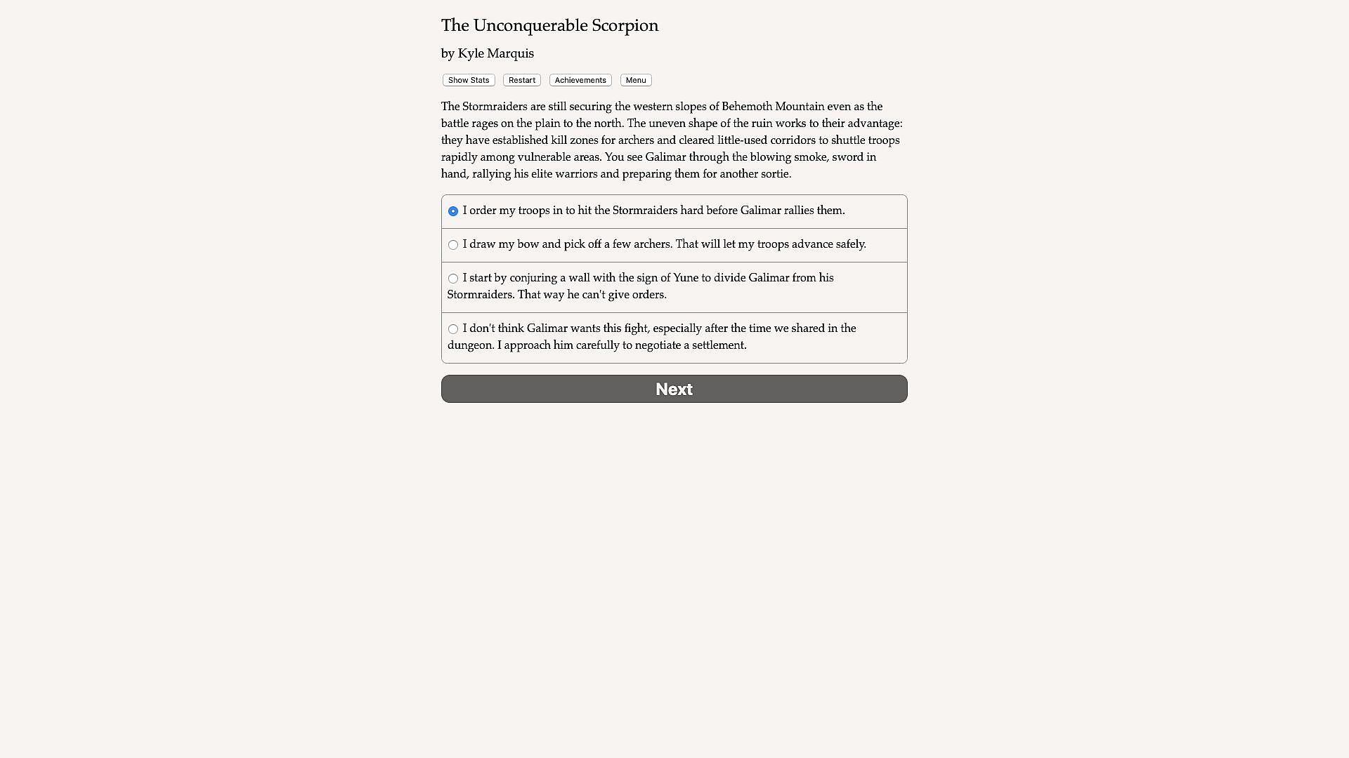 Pon Para and the Unconquerable Scorpion is a 742,000-word interactive fantasy novel by Kyle Marquis, and the sequel to Pon Para and the Great Southern Labyrinth. Your choices control the story. It's entirely text-based—without graphics or sound effects, and fueled by the vast, unstoppable power of your imagination.