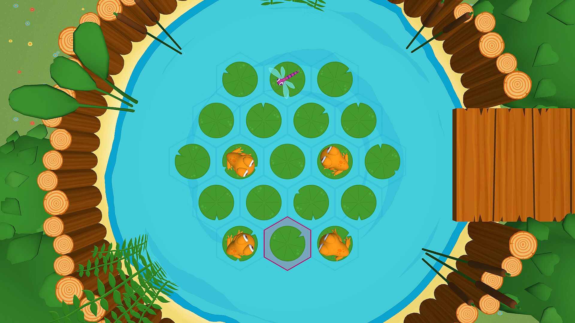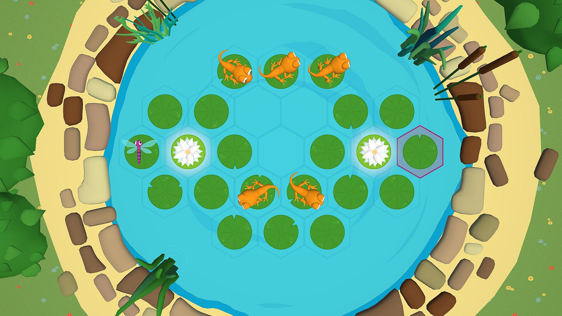 Frogs, geckos, fishes, and carnivorous plants are patiently waiting for their dragonfly snack. Twist your way across the pond to avoid the insectivores and make a safe dragonfly passage. Choose a tile to activate and spin its surrounding tiles, shifting their positions to guide the dragonfly to safety on the purple tile.