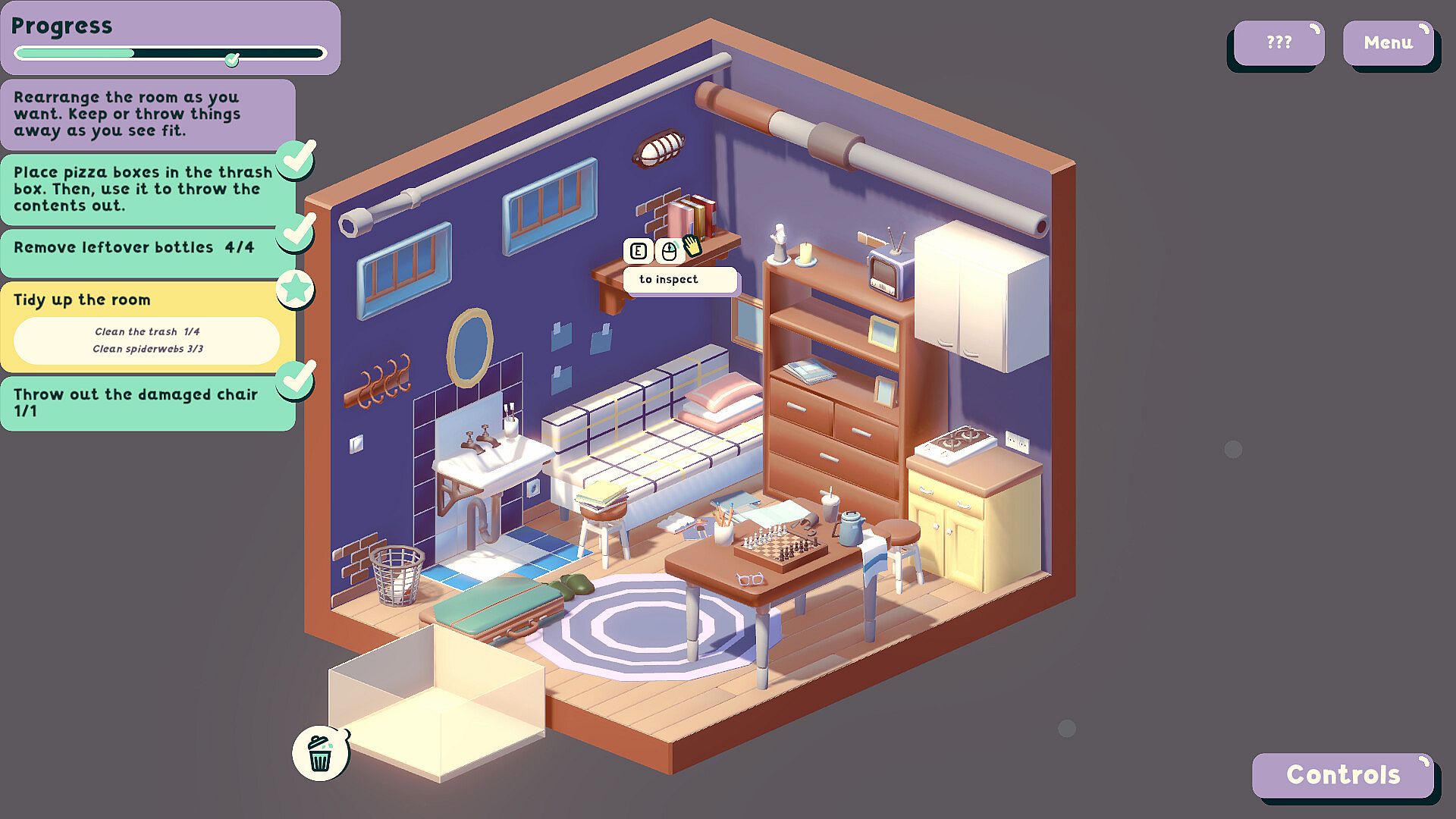 While dialogues provide context, the main story of each level is told through the discovery of interesting objects. Players must piece together the story, either to satisfy their curiosity or to help the clients with more than just a dirty apartment.
