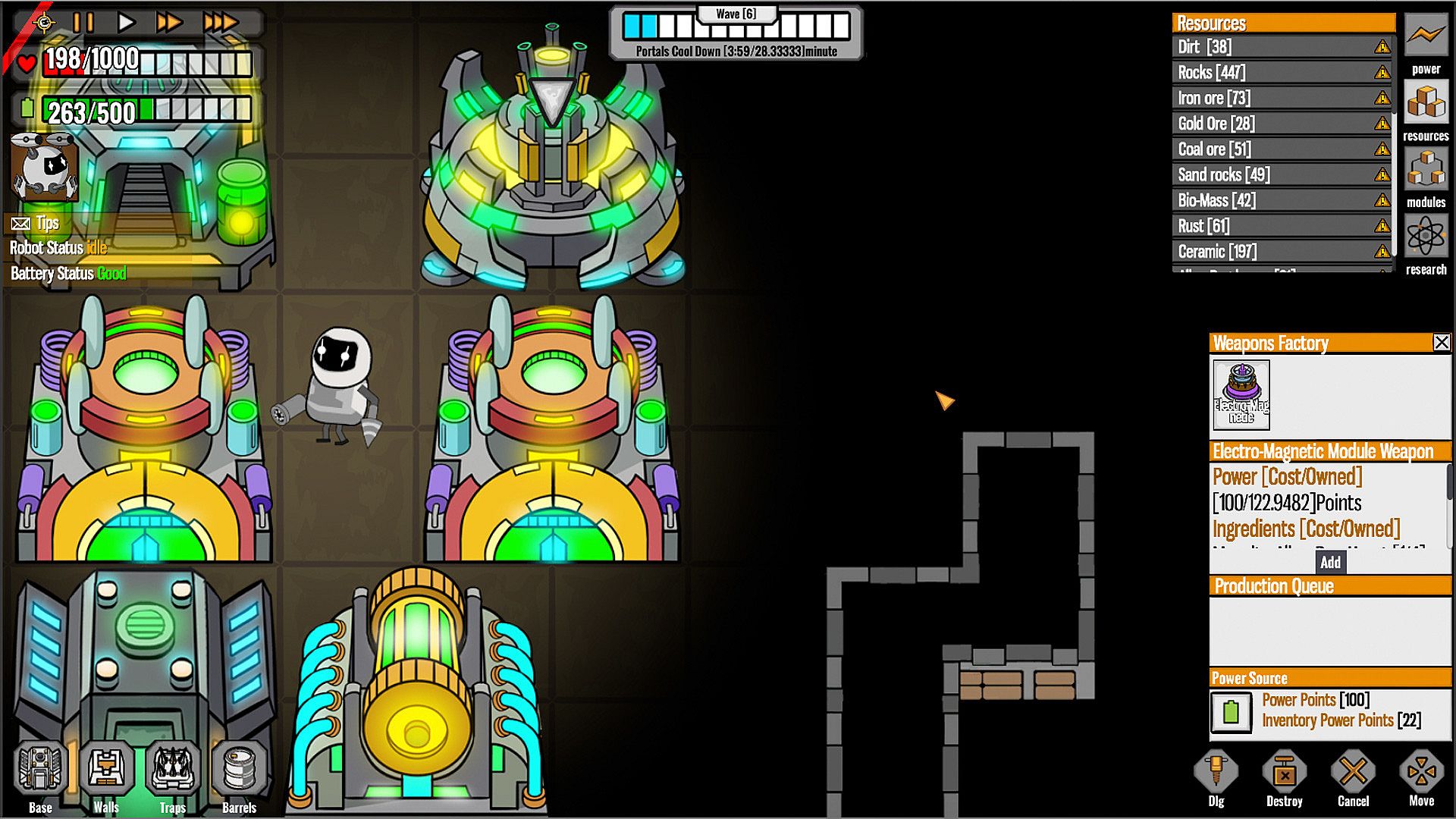 - Strategy : survive attacks for each portals active period and use portals cool down period for exploring and dig for materials and crafting and setup defenses an paths.. more over you should take care of robot's battery and manage power wisely..