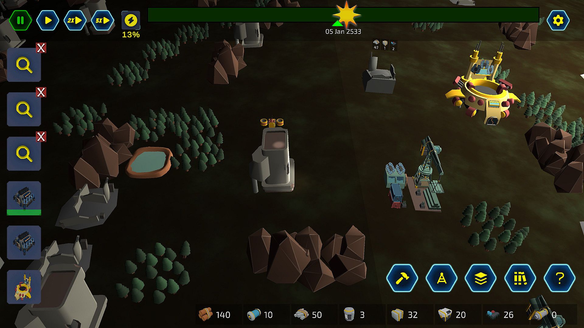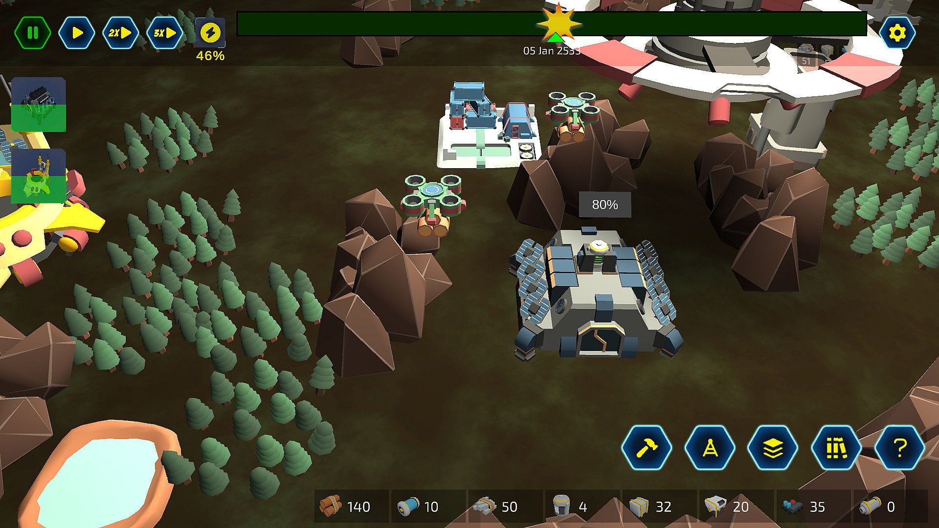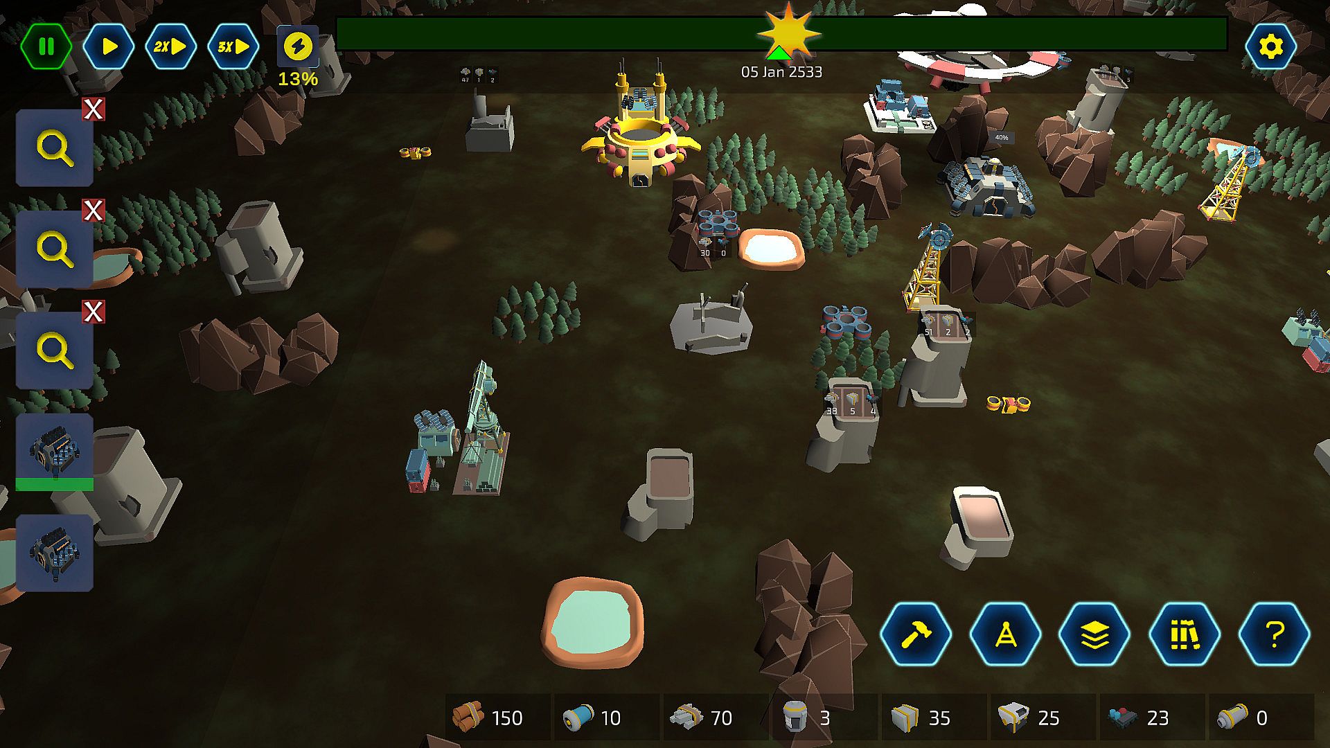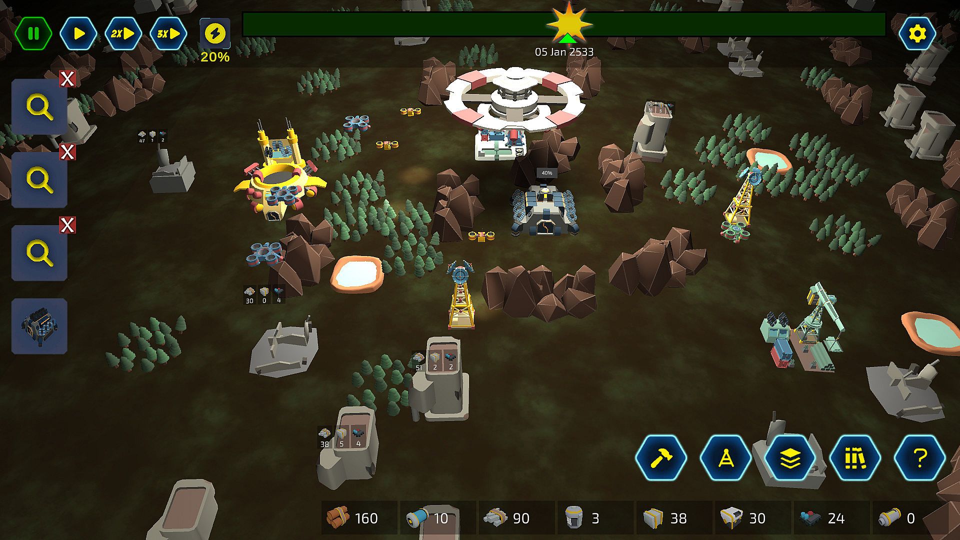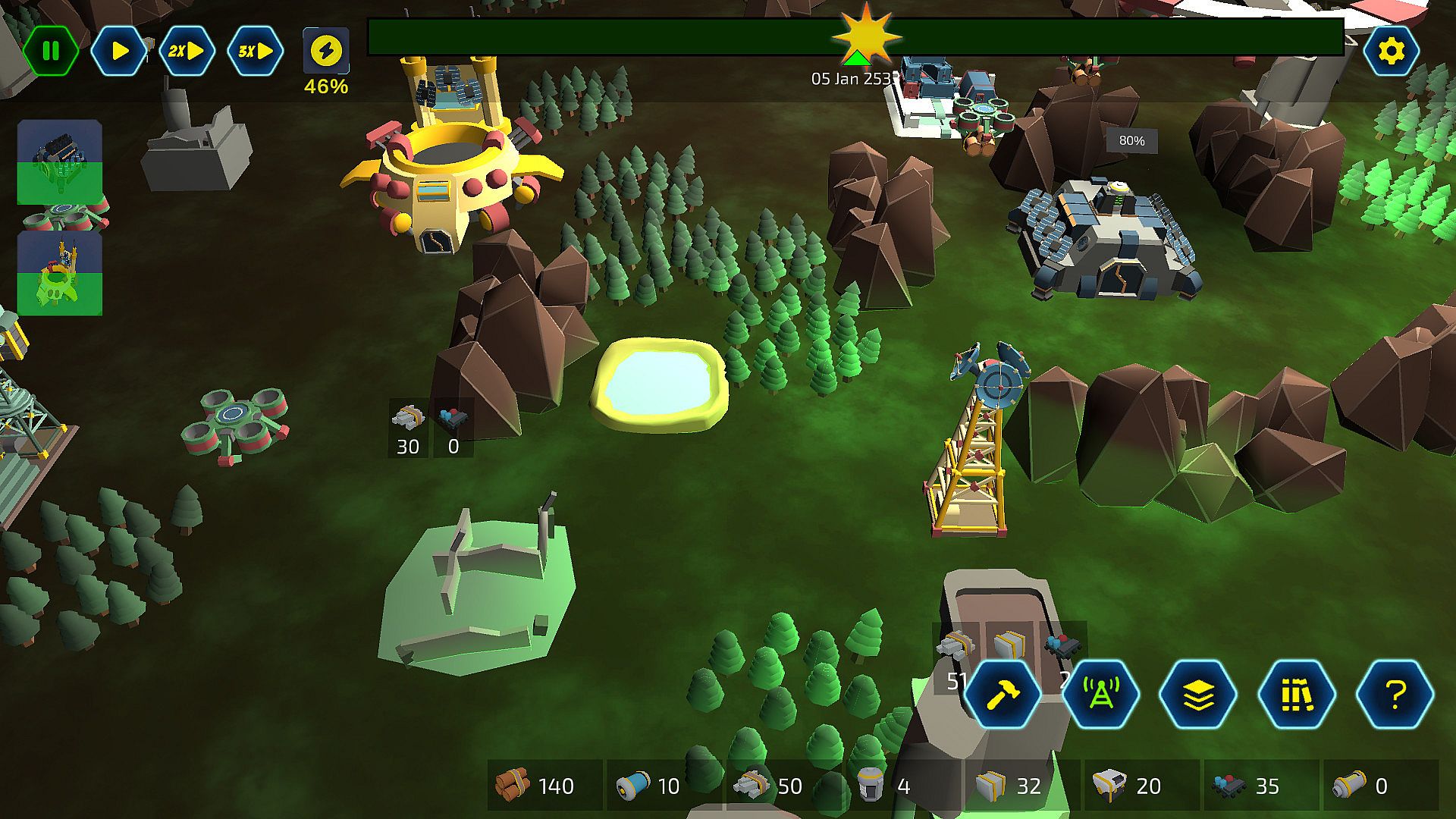 Now, 200 years after the disaster, your only ally is a tiny ray of the sunlight. It moves across the planet, and you can only build your base in its area. Anything plunged into darkness is out of operation. The game is built around the key mechanics of following the slipping ray of light.