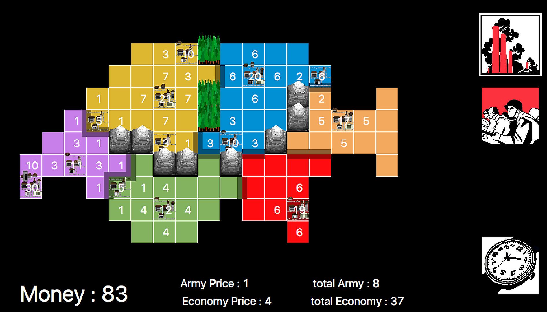 Unlike most other strategy games, where you have to wait for ages for the AI to make a move, Potemkin’s AI is almost instantaneous! This is because Potemkin was custom built in Python, a programming language usually used for scientific simulations. This makes the game run very quickly, even on old computers. Your days of finishing your turn and reaching for the phone are over!