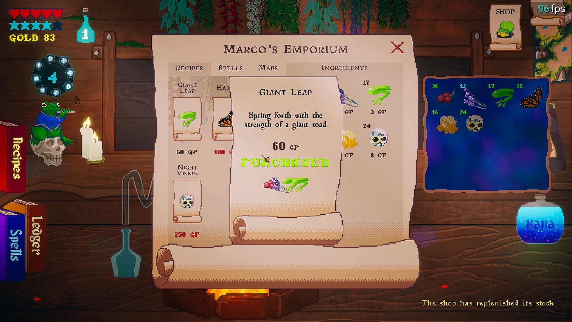 Brew and sell potions from your bustling cart in this indie 2D pixel-art shop management game. Buy ingredients from various regions, combine them into recipes, and juggle stock to fill customer orders during the day. Prep at night, drink potions for survival against enemies, and unlock spells to defend your setup. Travel across nine regions packed with unique recipes, dangers, and procedurally generated customers from different races. Mysterious patrons and foul foes test your skills as you collect new spells and fill your recipe book. Froggin the enchanted frog provides soothing local melodies, perfect for fans of ingredient crafting and mobile shop sims.