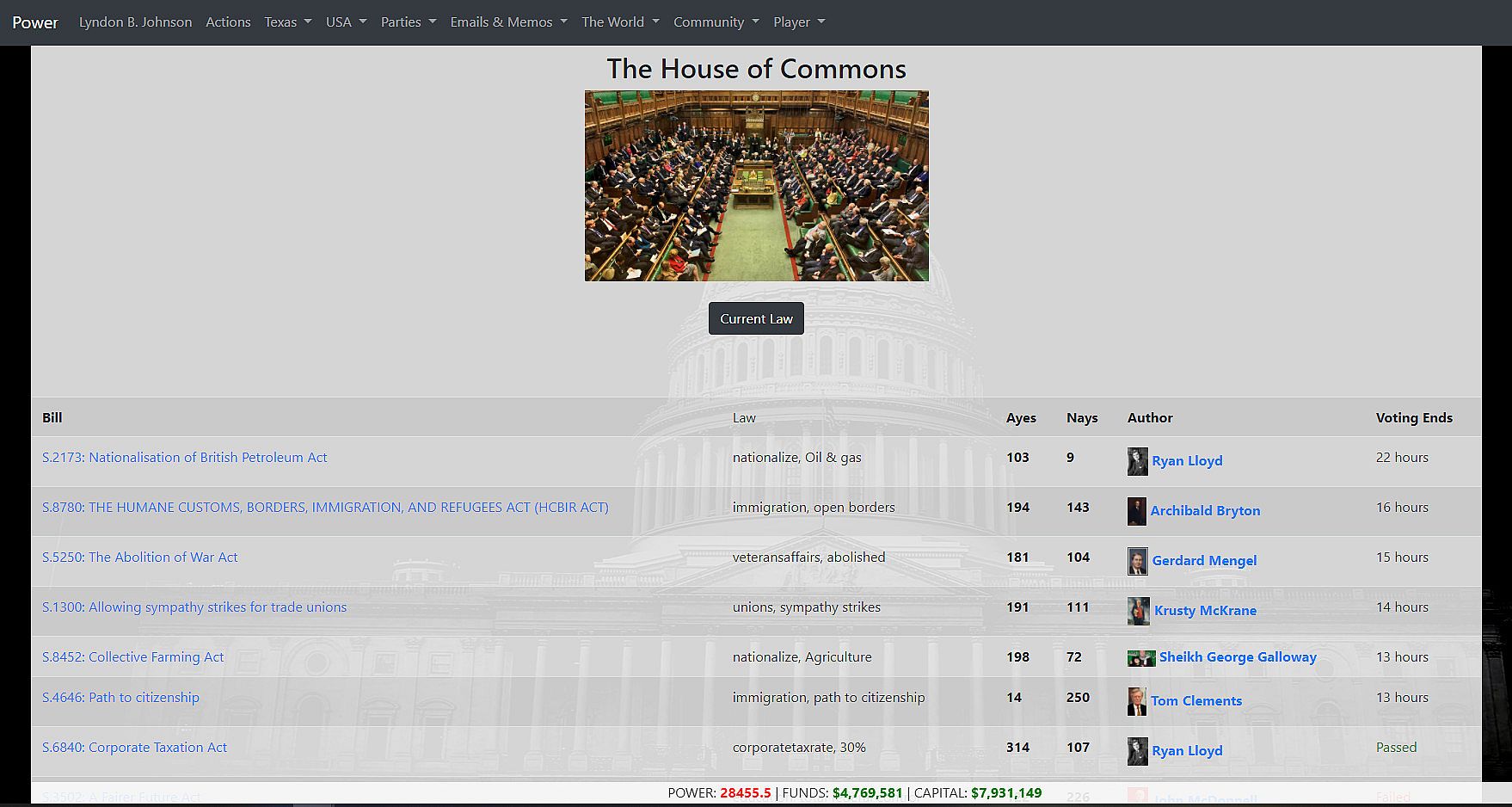 - Full legislatures where you can wheel and deal to pass your bill to change a large number of laws, which directly effect your country and the wider world