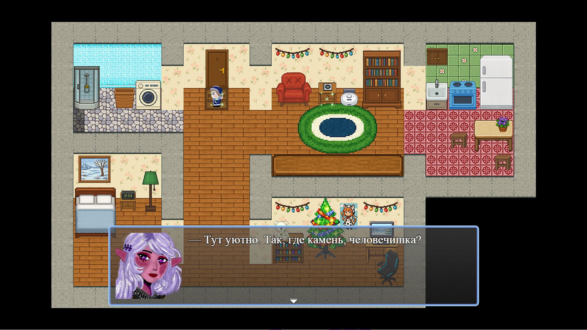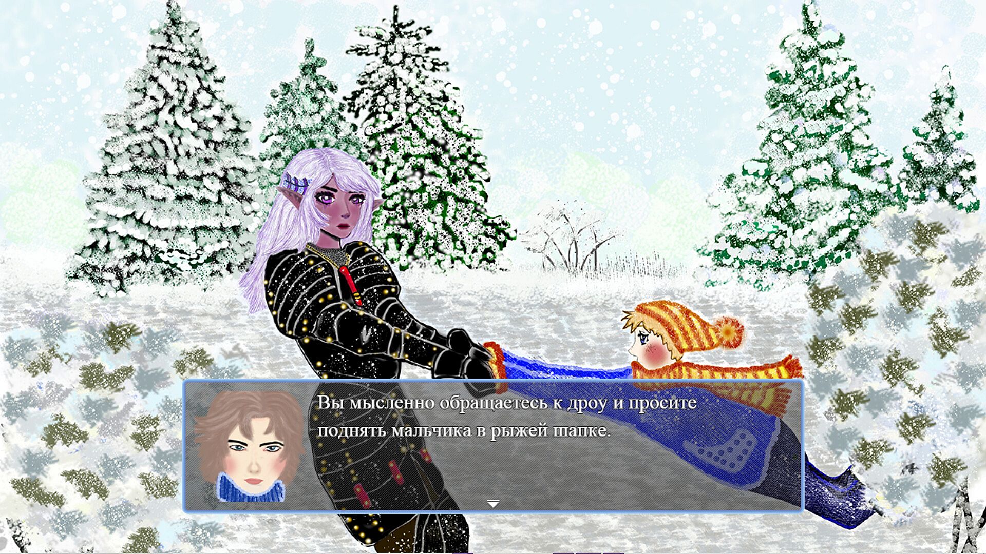 This is a romantic story about a Drow named Violet, who teleported to Russia in the early 2000s, and a simple Russian guy named Ivan, who found her. The dark elf went to our world in search of the missing stone from the family pendant. This is a story-oriented game, in the course of the story the player will be given the opportunity to solve emerging in-game situations in different ways. The total gameplay duration is 30-40 minutes. The game can end with two endings (a bad one and a good one).