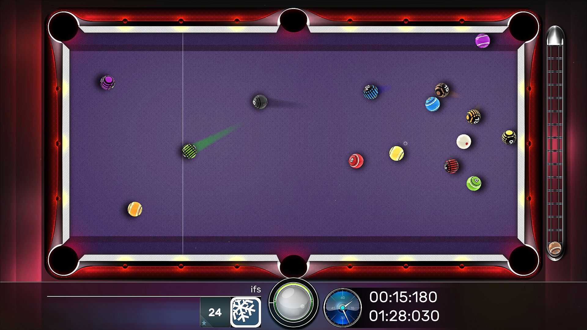 This is an arcade pool game, so to keep the game interesting we have several features that will affect the gameplay. Each cue has different features that make each cue special. These features include power, speed, aim and spin. Mastering different cues in Premium Pool Arena requires similar precision as weapons in fps games.