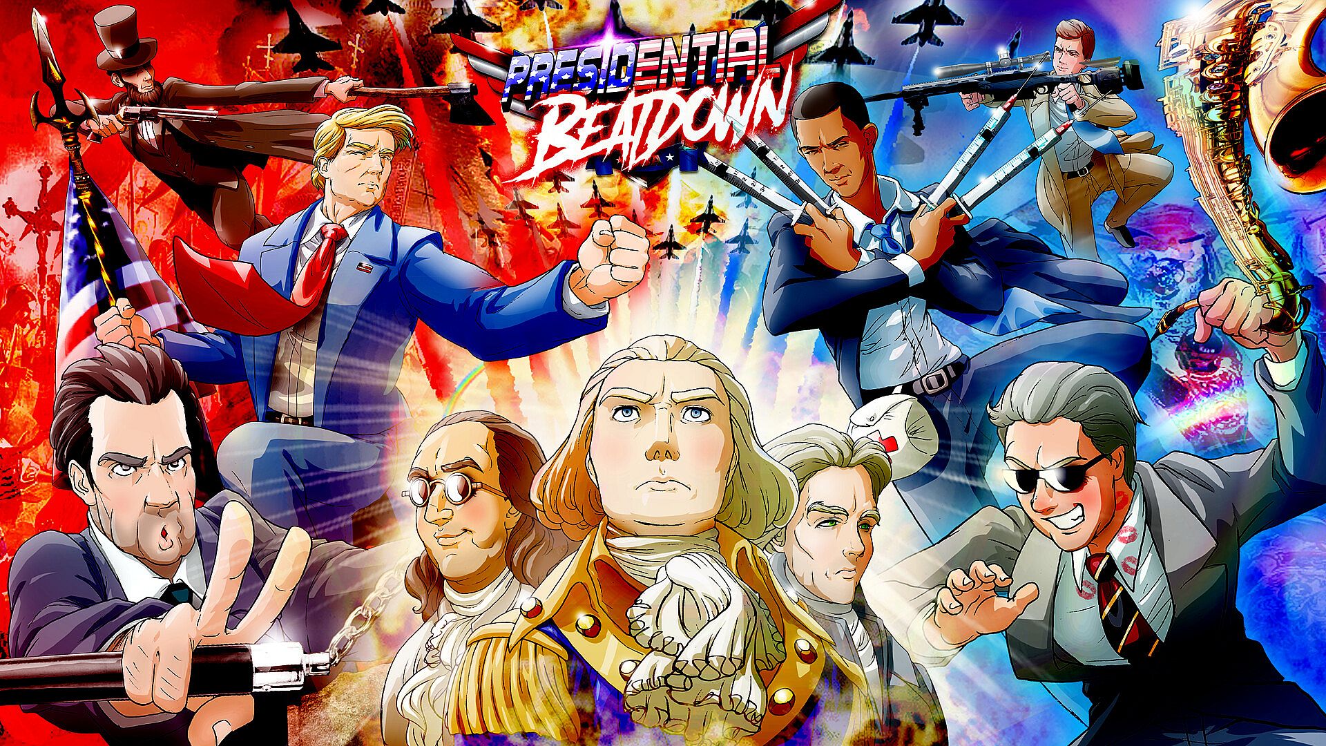 Super-soldier Presidents duke it out in this silly 2D multiplayer fighting game designed for local couch play on PC. Trump swings a golden lance and unleashes a Space Force energy weapon, Obama deploys Obamacare tools for damage and self-healing, and Washington wields a battleaxe, hatchets, and Model-1776 Chainsaw via Executive Orders. Fighters level up independently per profile, earning team-specific Coins from battles-full XP for winners, one-third for losers. Players clash in 100 all-American arenas like Mount Rushmore, a Navy battleship deck, and the Oval Office, using separate profiles for Player 1 and 2. A second controller enables head-to-head matches. This bare-bones action brawler suits friends craving quick, physical political showdowns.