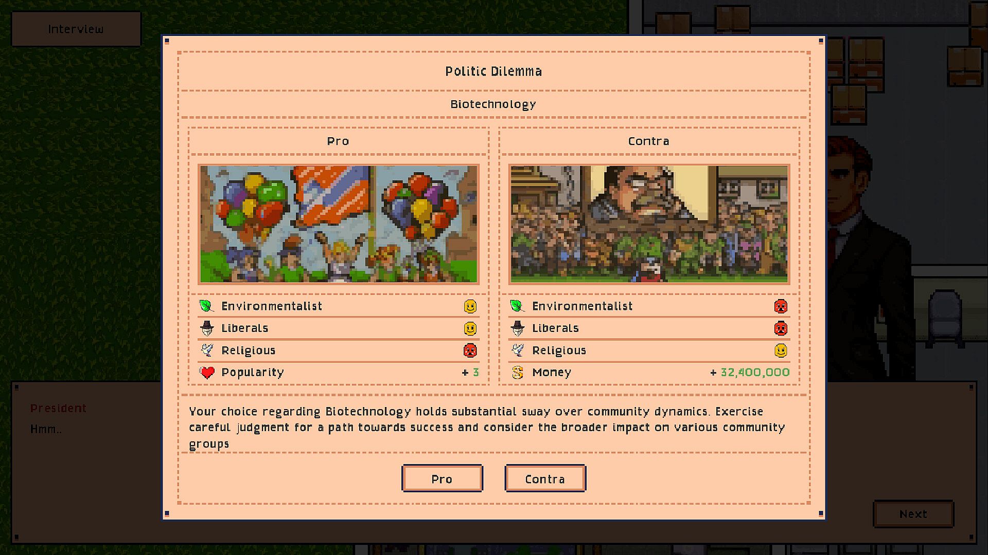 ️ Dynamic Decision-Making – Enact policies, give interviews, and steer national direction through tough moral and political choices.