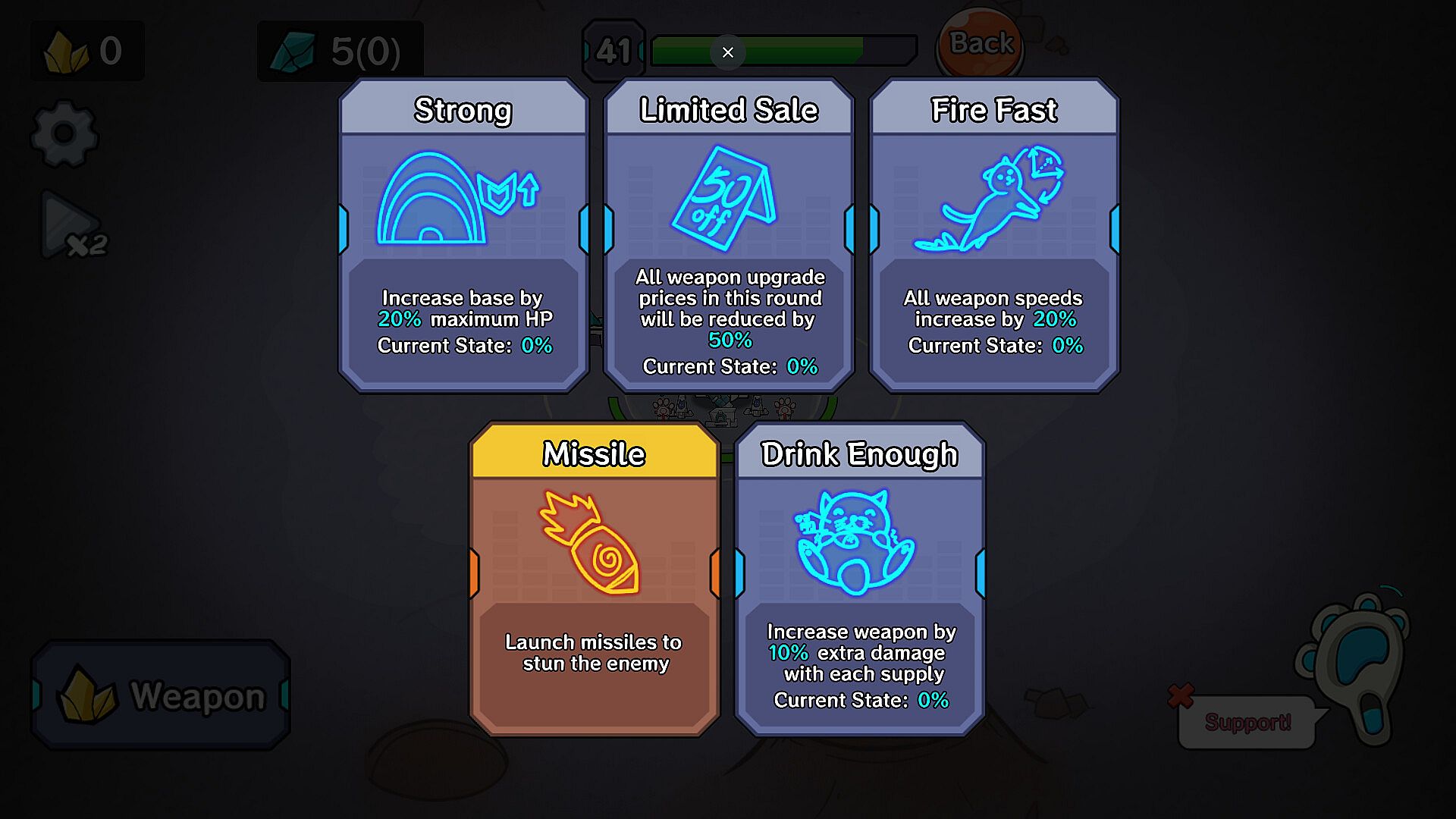 Reinforce base HP, improve automatic HP recovery, and add more supply skill uses—build an impregnable home base.