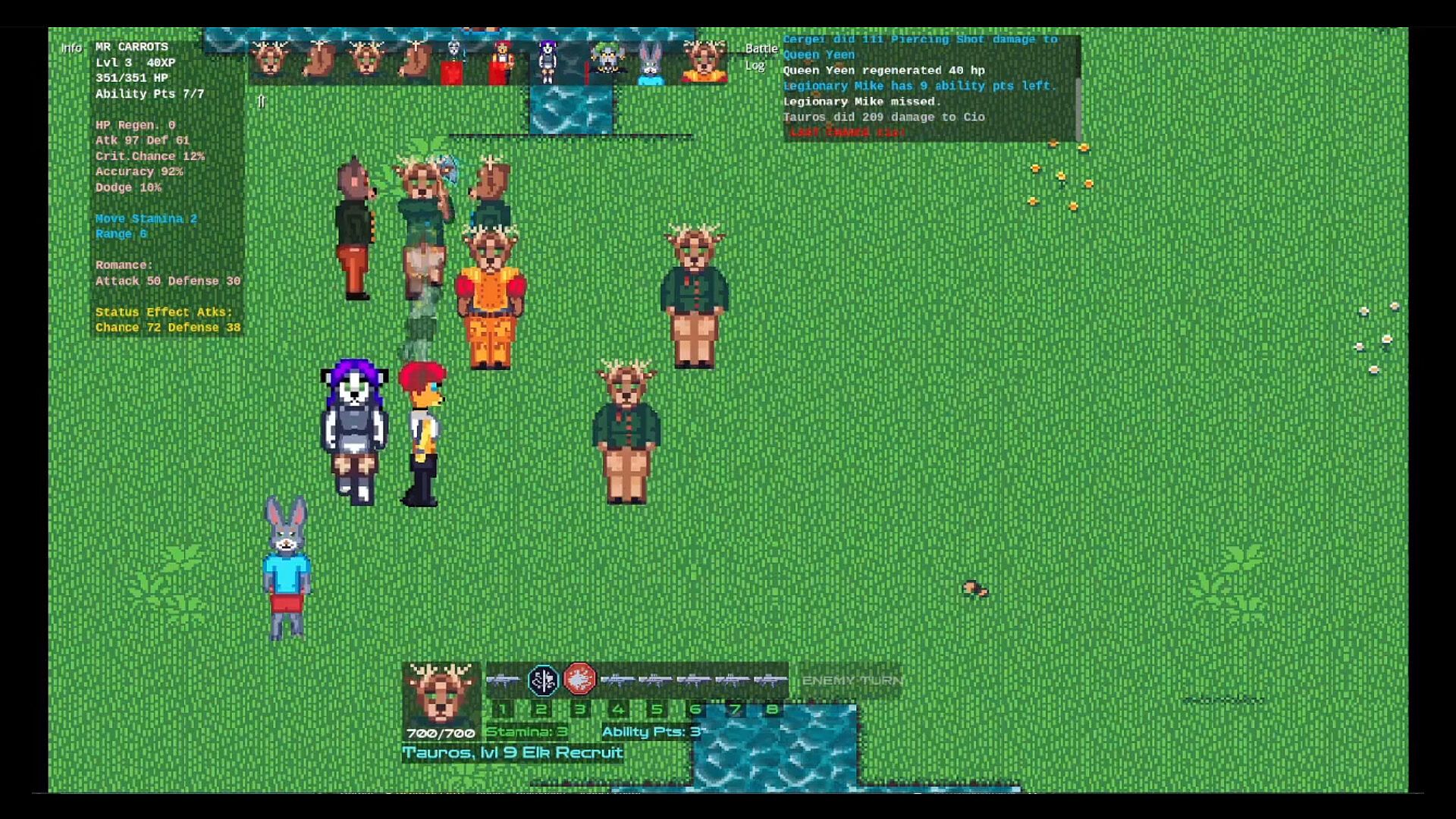 Captain Cio Greyfluff leads his crew of bunnies, big cats, and possums on a galactic quest for valuable Prismatic Gems. They stumble into the wars, romance, and politics among the Elk, Fox, and Hyena kingdoms. This strategy RPG blends turn-based grid combat with character classes and multiple combatants in battles against enemies and bosses.