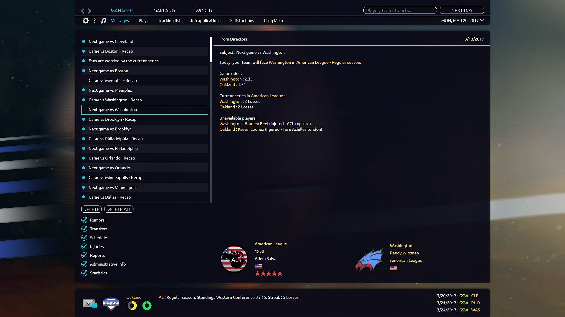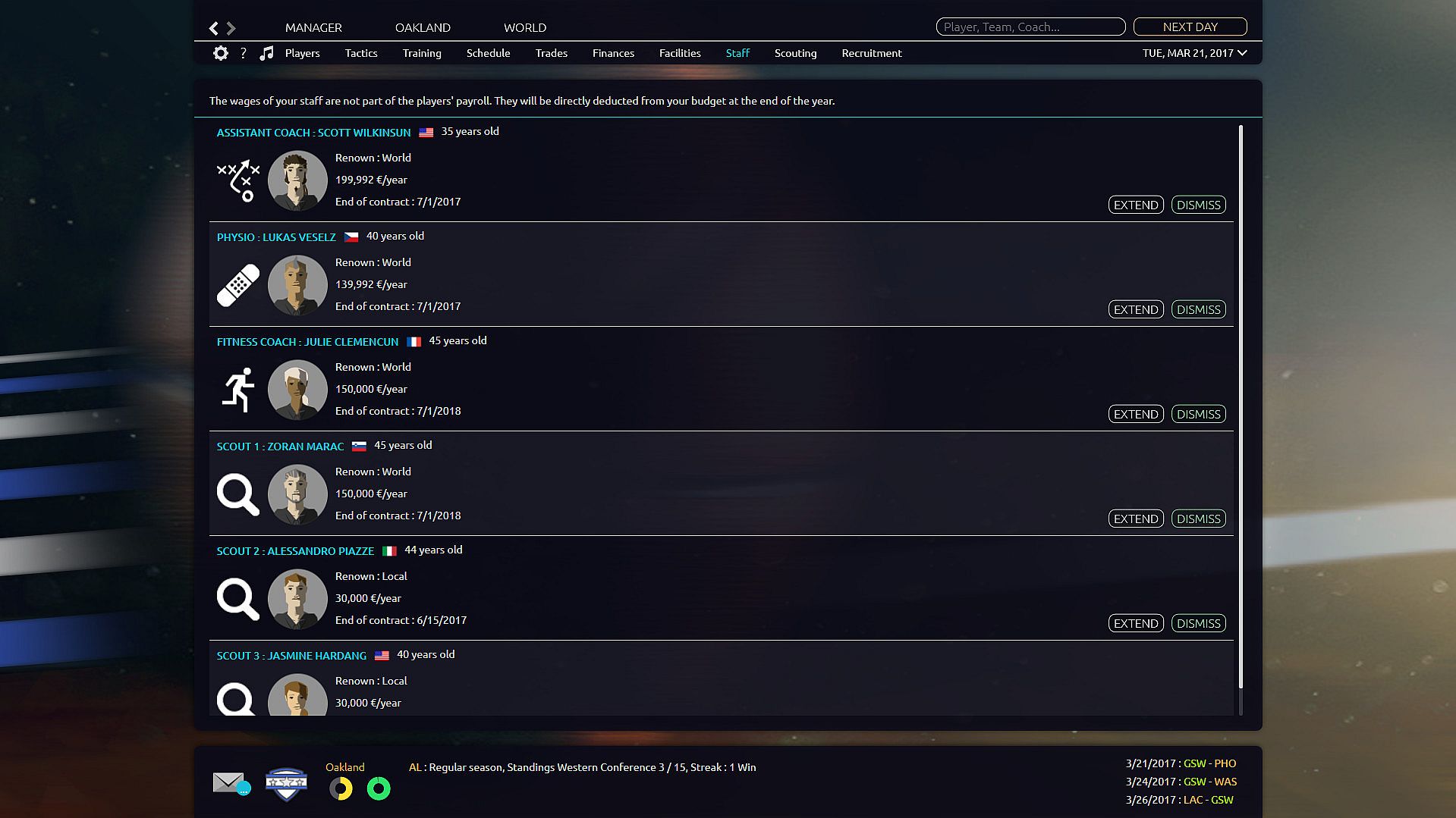 The recruitment process applied to your team will differ completely according to the league in which you play. If you run a non-professional team, in which the players are not paid, you must convince players to join your side by showing real interest in them. Whereas in the North American league, you will have to handle all the complexity of contracts, exceptions to avoid paying the luxury tax, not to mention trades or the draft. Finally, in the other leagues you will have to manage the buying of players, loans or free agents, taking care not to exceed the payroll allocated to your team for the season.