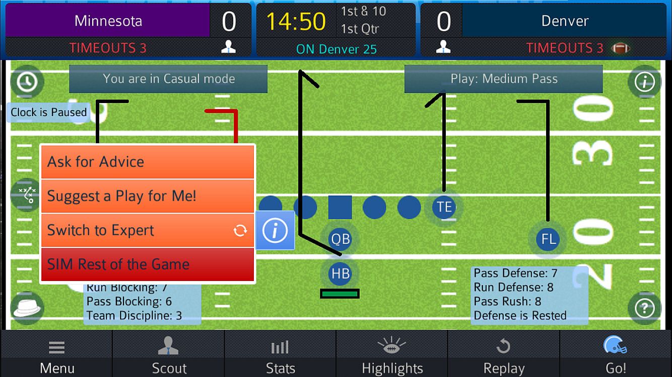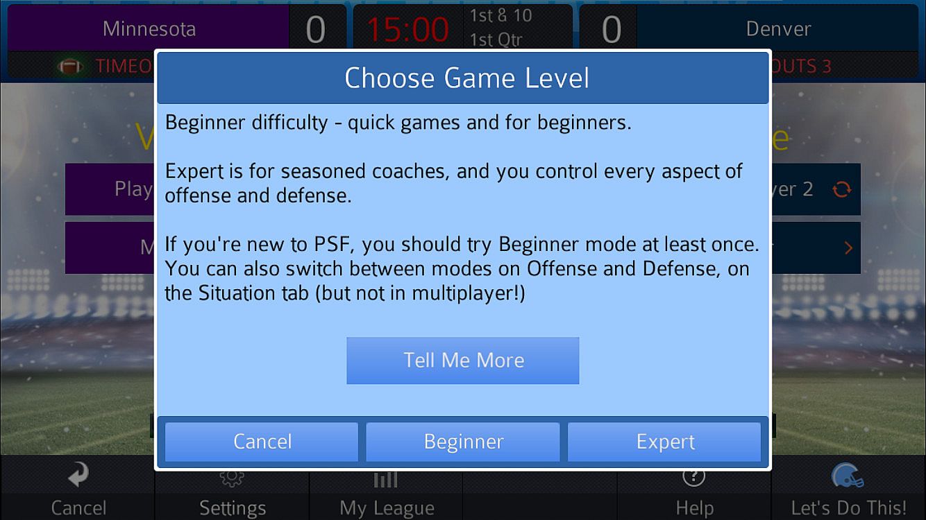 Choose your level of coaching difficulty. Select Basic level to play a relaxing game or choose Advanced to control every aspect of every play – who to motion, who to blitz or double team, how to shift your line, everything! And in-game help describes every feature, so you can learn football while you play!
