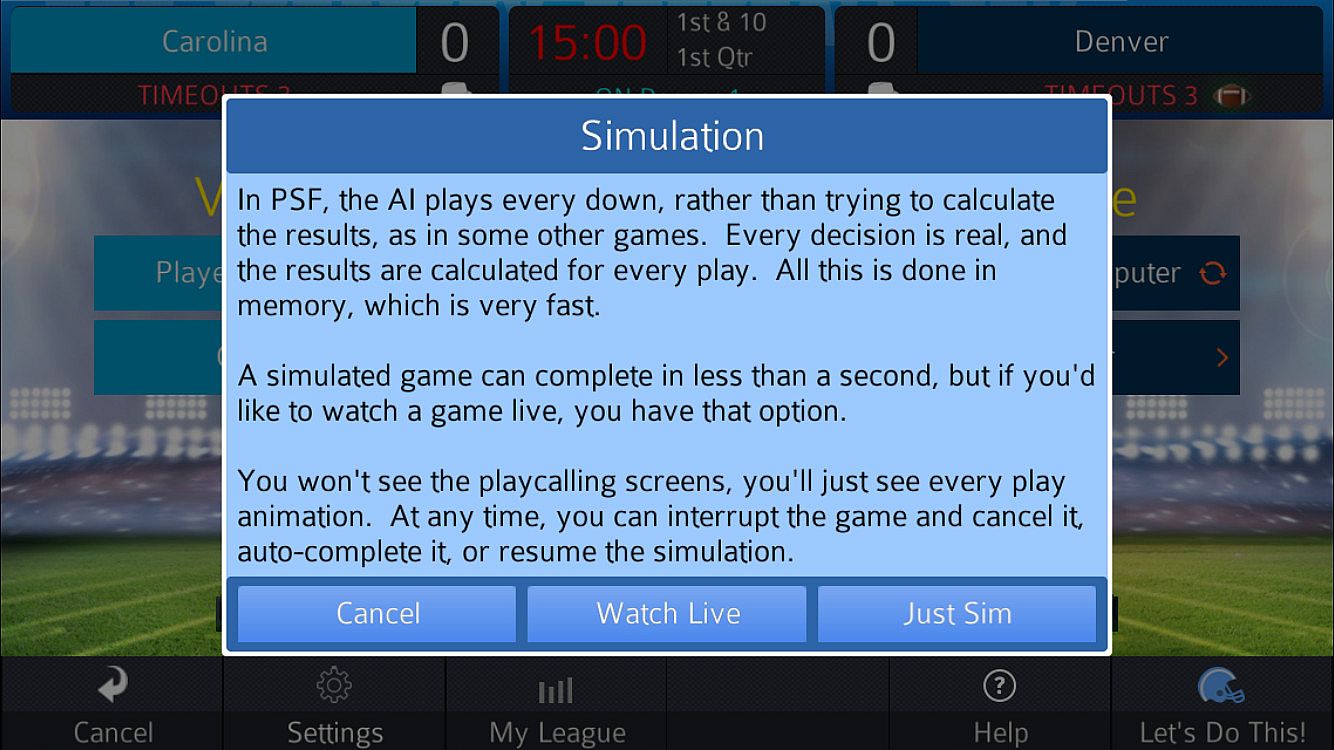 Pro Strategy Football is a realistic simulation (and game) of American Football. Built around a complex and realistic engine that was developed as a Computer Science Master's project, the game has grown over the years to become the most accurate simulation of coaching in American Football. You can watch simulated games live, too!