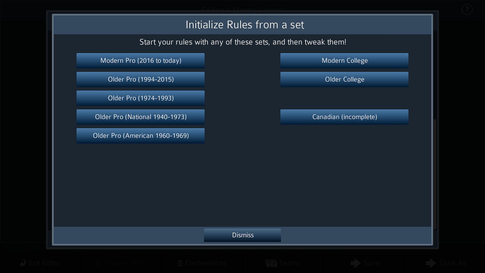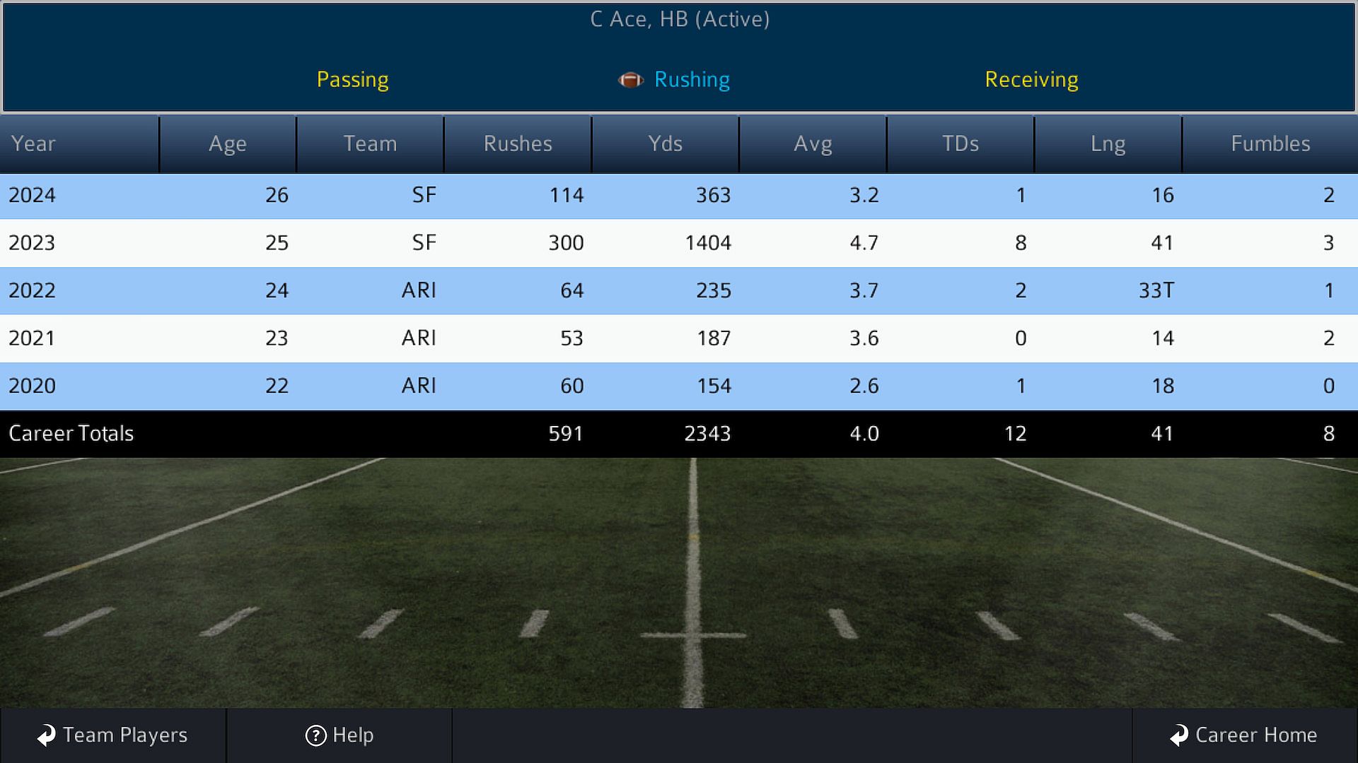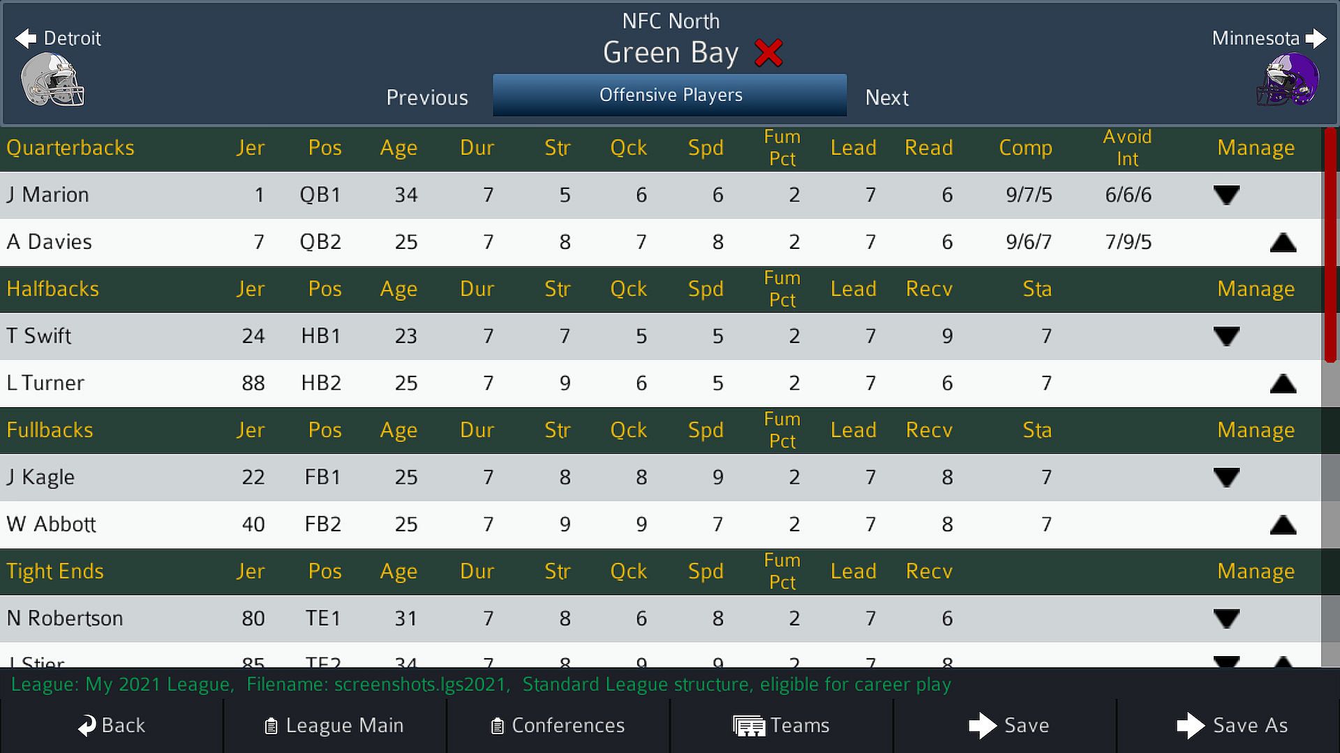 Career play is incredible, with optional Free Agents and support for most custom leagues (two conferences, each having 1, 2, 3 or 4 divisions, and currently limited to 32 teams). EACH season, you can load a custom schedule, choose to scramble the teams, and you can set the playoff format for the season! You can also choose whether you want to allow Free Agents (and how many), the order of the FA draft, and more!