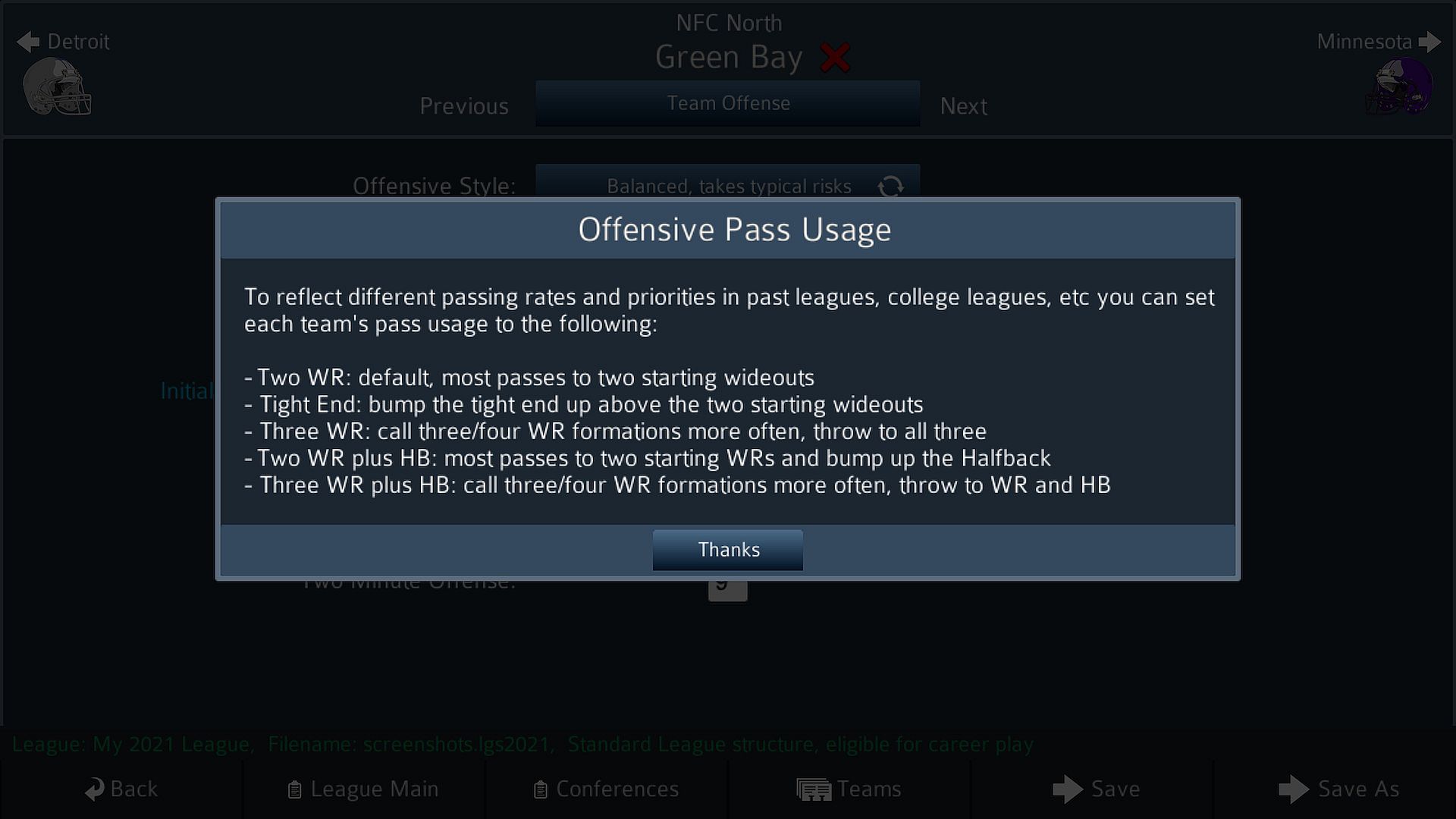 Game ships with a Pro 2021 league AND a 130-team College starter league, but that's not all! Over THIRTY schedules are included (as csv files), including a College schedule and a 21-week schedule for our Canadian fans! Modders are already creating many more leagues, image sets, sounds, and schedules! Play any actual season or create your own dream matchups!