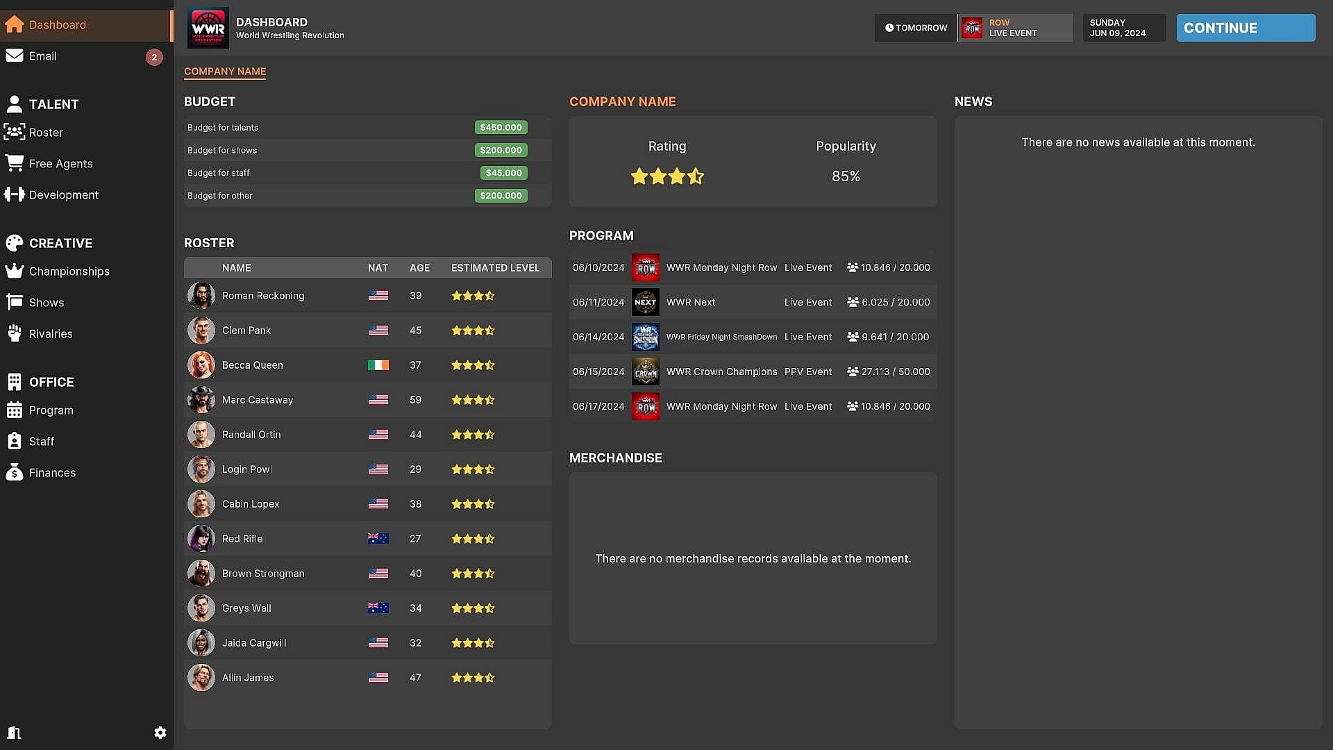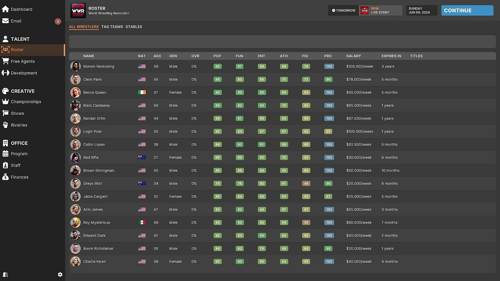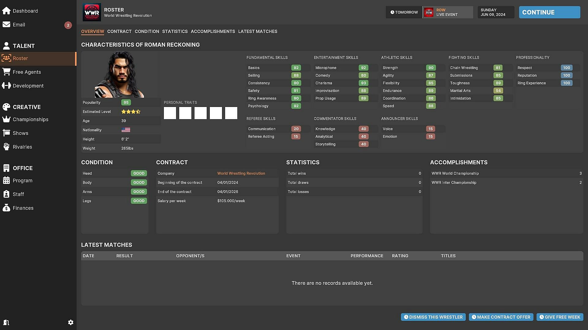 Building a successful wrestling company requires assembling a roster. You have the opportunity to recruit established performers or discover potential future superstars of the business. Assess their skills, negotiate contracts, and ensure they fit well within your organization. Likewise, if someone isn't meeting expectations or clashes with the team, you may need to make tough decisions and let them go.