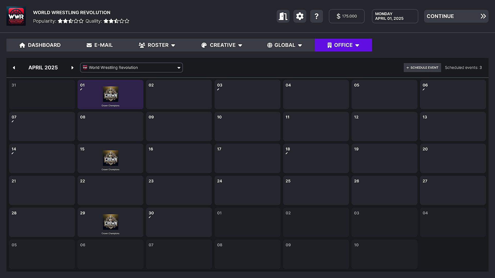 As the CEO, you'll have the power to schedule exciting wrestling events throughout the year. Carefully plan and choose the dates, venues, and tickets prices for your shows to maximize audience attendance and keep your fans engaged.